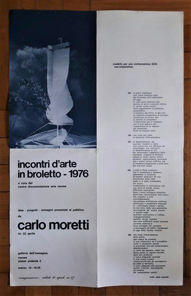 *Manifesto mostra Incontri d'Arte in Broletto 1976. CARLO MORETTI. Galleria dell'immagine Varese.