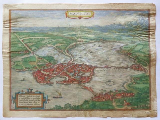 Dal “Civitates Orbis Terrarum”, Colonia, 1588 circa. Incisione in rame, colore d'epoca, cm 36,3 x 50,5 (alla lastra) più stretti margini; titolo in basso a sinistra, posto entro riquadro; testo latino al verso. George Braun (1541 - 1622), chierico di Colonia, è stato il principale curatore del “Civitates Orbis Terrarum”, per la prima volta pubblicato a Colonia nel 1572, poi edito ad Anversa e a Colonia fino al 1618, anno in cui apparve il sesto e ultimo volume. Queste le principali edizioni: 1572, vol. I; 1575, vol. II; 1581 vol. III; 1588 ca. vol. IV; 1598 ca. vol. V; 1618 vol. VI. Questi volumi vennero pubblicati originariamente in latino, e poi ristampati in tedesco e in francese. Il volume VI comprendeva un’edizione di piante supplementari. Dopo il 1618 le lastre divennero di proprietà di Abraham Hogenberg, il quale si incaricò delle successive riedizioni. Alla sua morte, le lastre vennero acquistate da Jan Jansson il quale, usandole come base, pubblicò un’edizione in otto volumi, riedita a sua volta negli anni successivi. Veduta prospettica della città di Mantova attorno al 1550, resa con una prospettiva di ampio raggio a volo d'uccello. Difetti e gualciture del foglio (riparati e rimarginati) nella parte bassa dell’inciso e ai margini, piega centrale leggermente soggetta ad usura, buono l’inciso, nell'insieme in più che accettabile stato di conservazione.