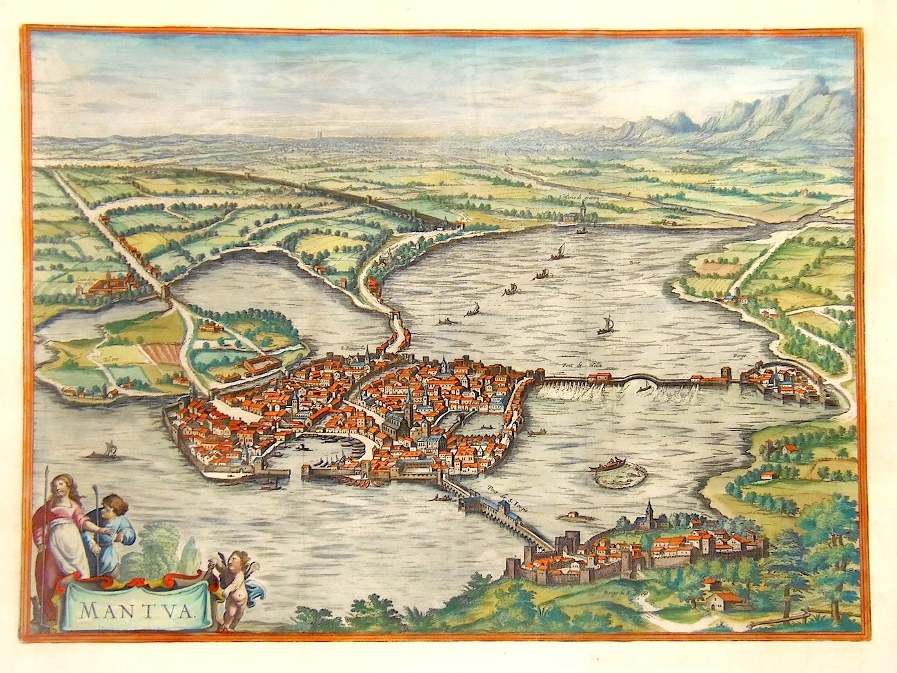 Incisione in rame, colorata, mm 362x497.<BR>Bella veduta generale a volo di uccello tratta dall'opera di J.G. Graevius "Thesaurus antiquitatum et historiarum Italiae", tomo IV. Si tratta di una copia fedele della stampa di Braun e Hogenberg del 1575 con delle varianti nella posizione e composizione dei cartigli; quello originale è qui sostituito dal classico barocco con figure. Ottimo esemplare con le consuete tracce di pieghe verticali editoriali. Margine inferiore destro reintegrato. Mantova nelle stampe, 27. <BR>