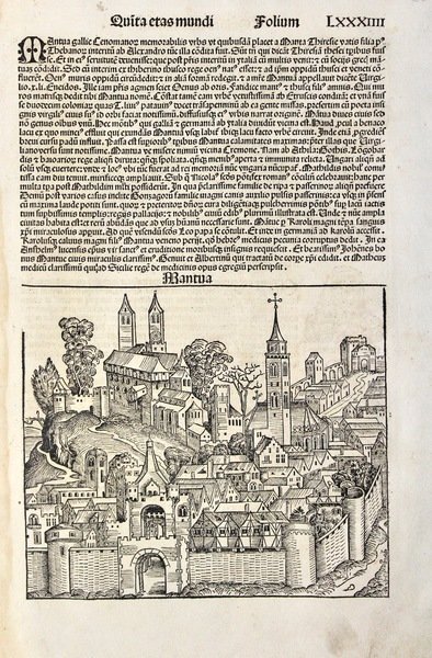 Silografia, mm 190x225 (sheet 440x280). Ottimo stato di conservazione con lieve alone al margine destro. Veduta fantastica della città con relativa descrizione con testo latino. Il "Liber Chronicarum" comunemente chiamato "Cronaca di Norimberga" dalla città di stampa, fu la prima opera contenente anche raffigurazioni reali delle città del mondo ed ebbe un enorme successo, tale da essere considerata una pietra miliare nello sviluppo della conoscenza geografica.