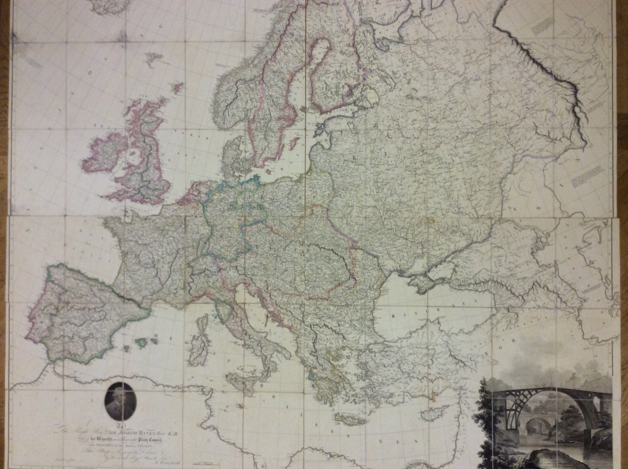 Grande carta geografica dell'Europa, inc. in rame e a colori. E' composta di 4 fogli, montati su tela, ciascuno di cm. 64,5 x 73,7, suddivisi in 15 riquadri: vi figurano anche un ritratto del dedicatario, Sir Joseph Banks (President of the Royal Society), e una bellissima veduta che inquadra il titolo. Cfr. Tooley's Dictionary of Mapmakers, p. 24: Aaron Arrowsmith (1750-1833), English cartographer, engraver and publisher. Hydrographer to his Majesty. Established in London ca. 1770 and in 1790 set up his own establishment. In all he issued 200 maps, mostly large scale, and was easily the foremost cartographer of his time. Con aloni alla tela di due fogli, altrimenti ben conservata e contenuta in astuccio.