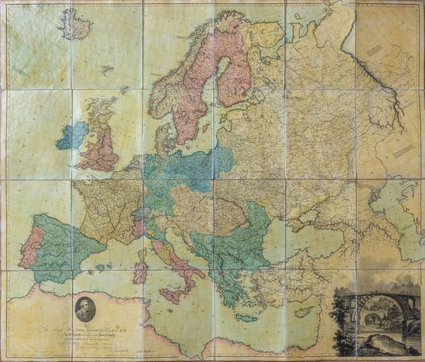 Grande carta geografica dell'Europa di mm 1260x1500 complessivi, suddivisa in 24 sezioni ognuna di mm 320x245, montate su tela. Incisione in rame, dipinta d'epoca. Grande cartiglio figurato assai fascinoso in basso a destra. La carta è dedicata al consigliere reale Joseph Banks. Interessante carta considerata all'epoca come una delle più aggiornate. "The Arrowsmith output was prodigious: clarity and accuracy were his aims-and he achieved them as no other English cartographer was able to before him. His maps are still essential to historians who want to delve into the history of 18th-century exploration in the Pacific" (Tooley, Landmarks, 98). Ottime condizioni, presenta una lieve tonalità gialla dovuta ad un sottile velo di vernice protettiva. <BR>