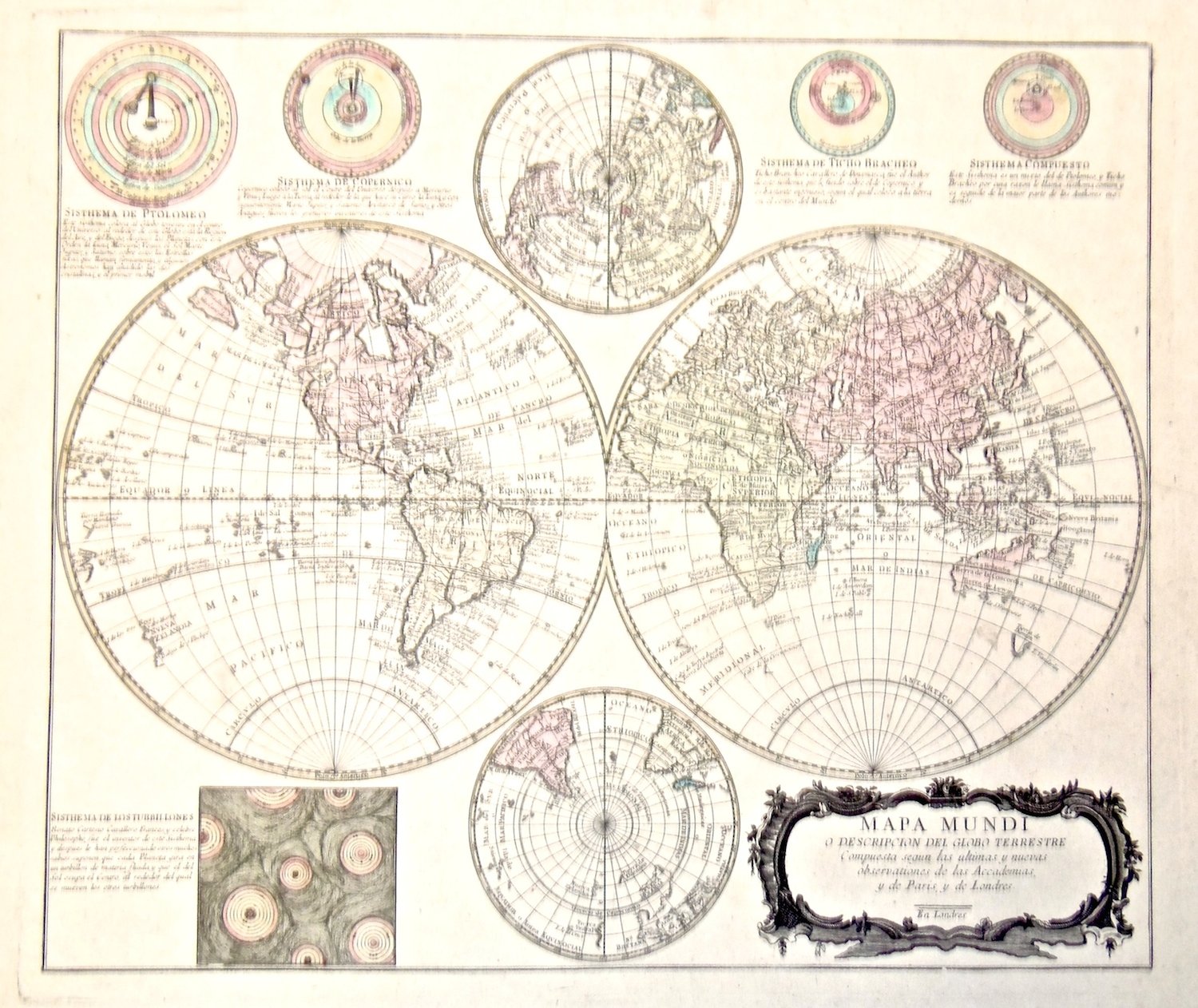 Copper engraving, original colour, mm 480x555. Rare spanish map showing four different systems of the universe and Descartes' vortex theory at bottom. Full margins, very good condition, traces of glue on verso.<BR>Incisione in rame, colorata d'epoca, mm 480x555. Rara carta spagnola con doppi emisferi e emisferi polari, in alto quattro diversi sistemi dell'universo, da Tolomeo a Brahe, mentre in basso è illustrata la teoria dei vortici di Cartesio. Pieni margini, ottime condizioni, traccia di colla al verso. <BR><BR>