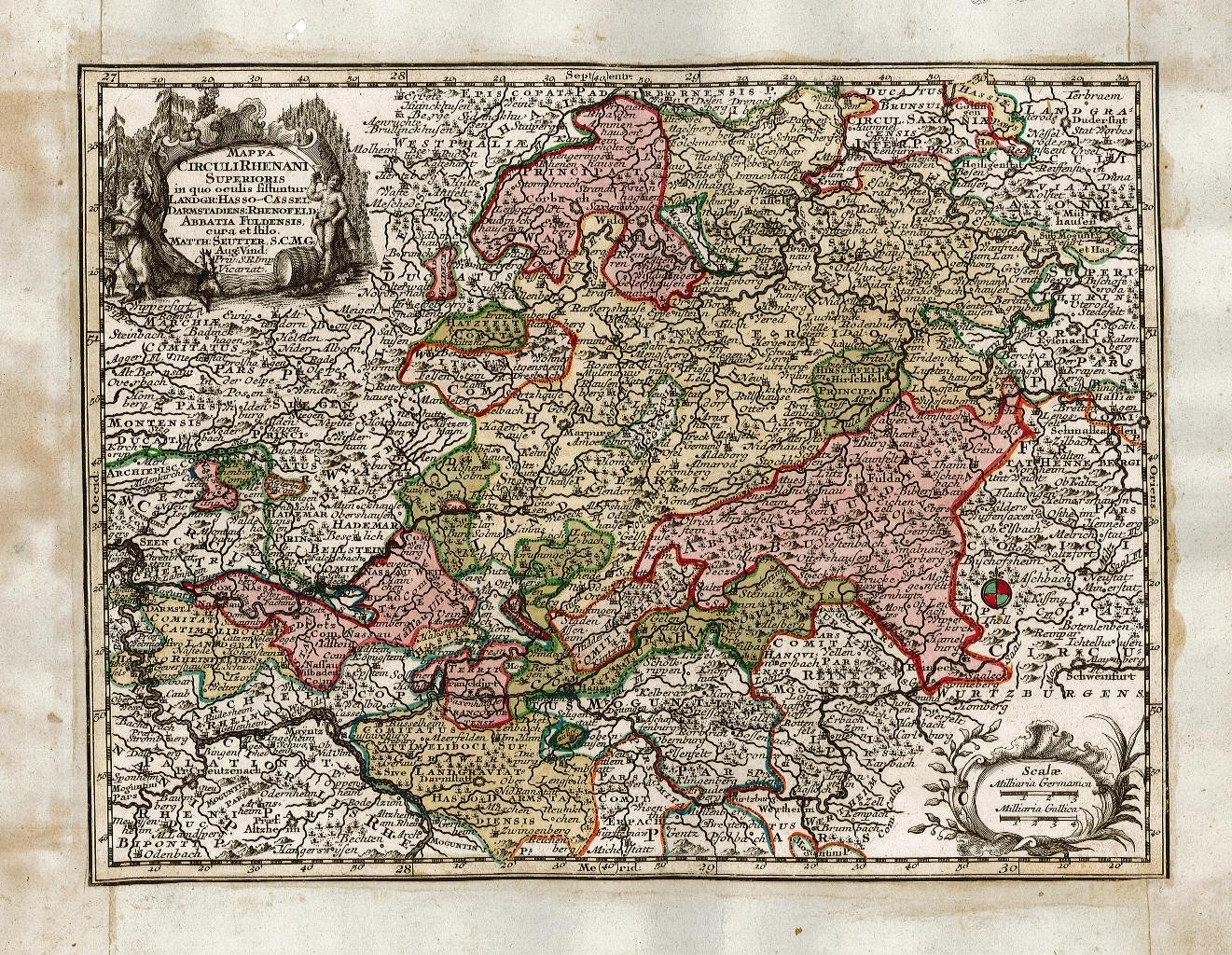 Incisione, antica ed originale, raffigurante la carta geografica della Germania. Inserita nell'opera "Atlas Minor praecipua Orbis Terrarum Imperia Regna et Provincias Germaniae Potissimum" pubblicata ad Augusta. La stampa, in coloritura coeva, è appilcata su margini anticamente riportati