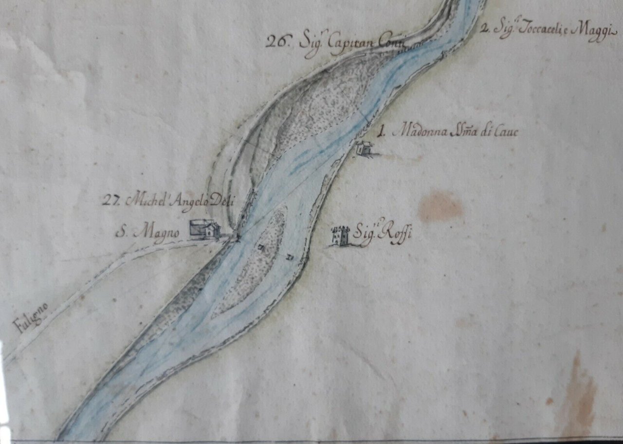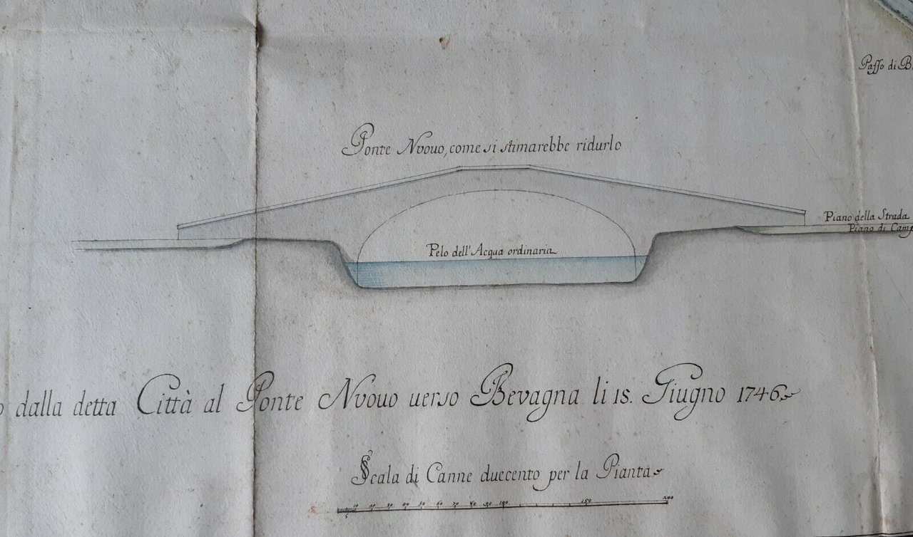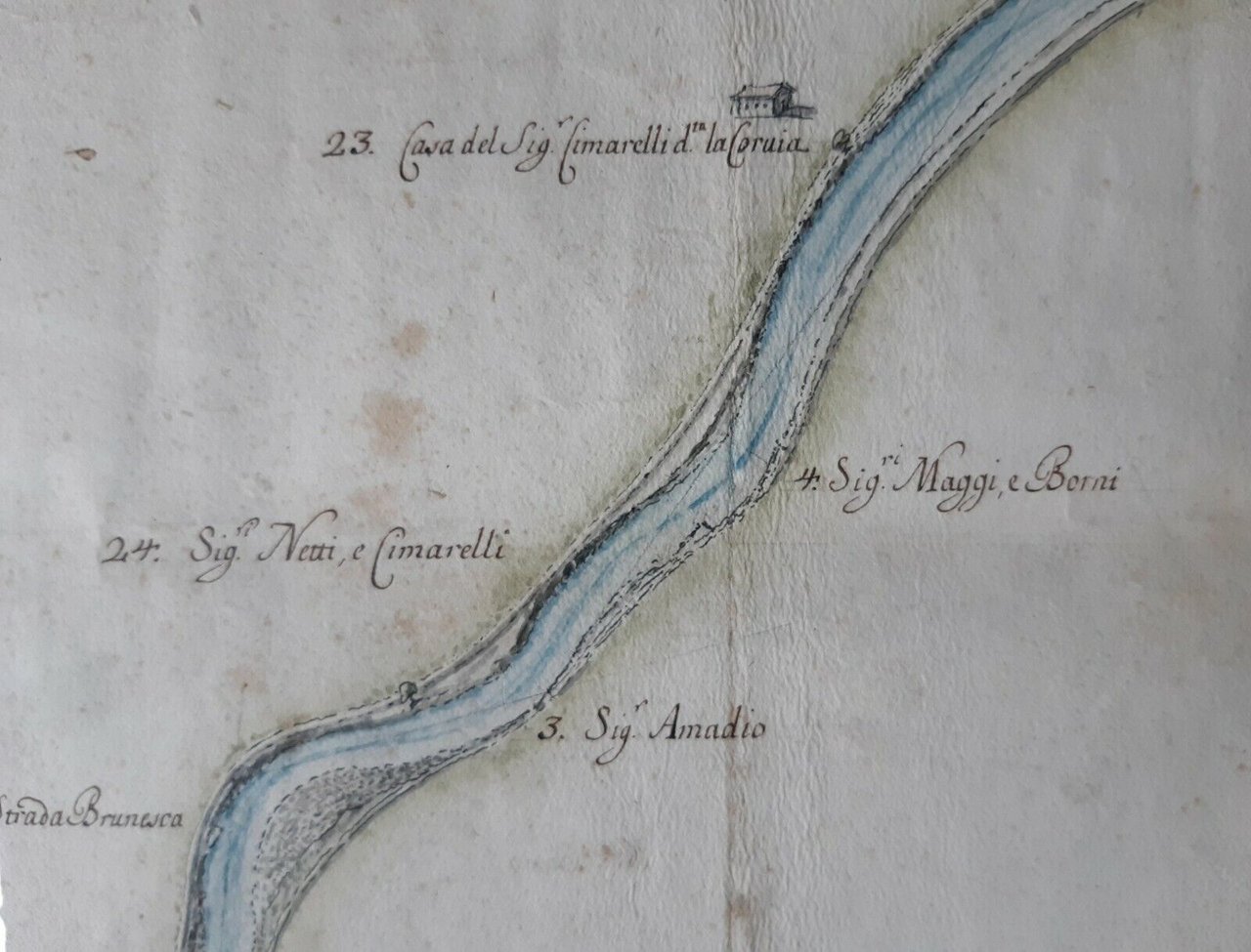 MAPPA ESATTA DEL CORSO DEL FIUME TOPINO NEL TERRITORIO DI FULIGNO DALLA DETTA CITTA' AL PONTE NUOVO VERSO BEVAGNA 15 GIUGNO 1746