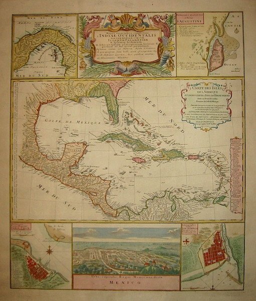 Carta geografica originale (cm. 49x58 più ampi margini bianchi). Bella coloritura antica all’acquarello. Ottimo esemplare. Affascinante carta dell’America centrale con il Mar dei Caraibi e l’Arcipelago delle Antille (opera del cartografo francese J.B. D’Anville e datata 1731), circondata da altre mappe e piante (Panama, Vera Cruz, Santo Domingo e il porto di Sant’Agostino in Florida) e da una veduta a volo d’uccello di Città del Messico.