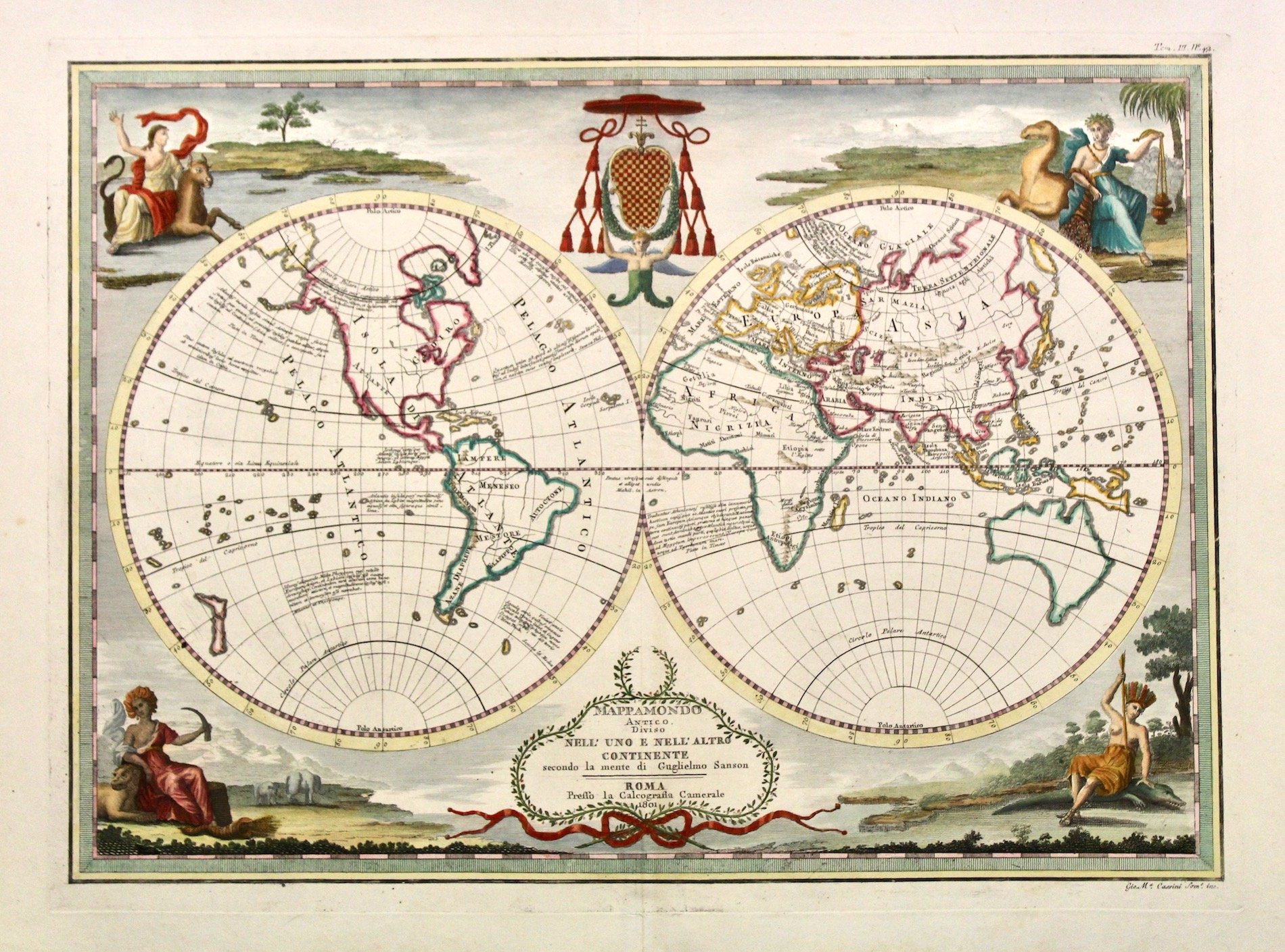 Incisione in rame, mm 370x508 (battuta della lastra), dipinte a mano. Piacevole e decorativo mappamondo arricchito da raffigurazioni allegoriche dei quattro continenti negli angoli, mentre al centro campeggia uno stemma araldico cardinalizio. Ottimo esemplare marginoso. Tratta da "Nuovo Atlante Geografico Universale delineato sulle ultime osservazioni", edito a Roma dal 1792 fino al 1801. La Calcografia Camerale gli commissionò l’opera per sostituire il "Mercurio Geografico". Giovanni Maria Cassini (1745-1824), allievo di Piranesi, fu religioso, geografo, costruttore di globi e cartografo. Copper engravings, mm 370x508 (platemark), colored. Decorative world map with allegorical illustrations of the continents in the corners, from "Nuovo Atlante Geografico Universale delineato sulle ultime osservazioni", printed in Rome form 1792 to 1801. Giovanni Maria Cassini (1745-1824) was religious, cartographer and globe maker. Very good condition.<BR><BR>