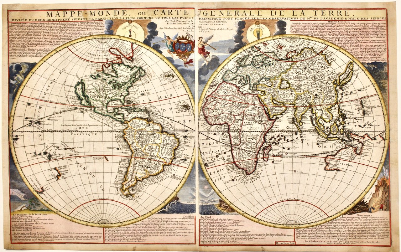Incisione in rame, mm 440x706, colorata d'epoca ai confini. Non comune ed elegante mappamondo inciso da H. Van Loon su due lastre stampate ravvicinate su di un foglio. Si tratta della riduzione della grande mappa murale dello stesso de Fer, pubblicata nel 1695 sotto gli auspici della Academie Royale des Sciences con criteri astronomici moderni. Numerosi sono comunque ancora gli errori geografici presenti: Australia e Nuova Guinea sono attacate, così come anche asia ed America; la California appare ancora come isola ed il Mississipi sfocia molto a sud est rispetto alla realtà. Negli angoli sono raffigurati vari fenomeni naturali ed atmosferici. In basso a destra vi è la nota editoriale "Chez l'autheur dans l'Isle du Palis sur le Quay de l'Orloge a la Sphere Royale" con data 1700; in alto al centro sotto al titolo c'è la dedica al Delfino di Francia ed una nota eitoriale con data 1705, segno di una evidente seconda tiratura. <BR>Buon esemplare con qualche strappetto restaurato (nel margine) rimarginata a sinistra ed in alto in modo speculare per circa 6 cm da entrambe le parti rispetto alla piega centrale, qualche traccia di umidità leggera. <BR>Shirley, 600, "Rare".