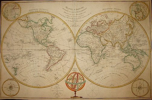 Mappe-Monde divisée en deux Hemispheres Oriental et Occidental assujetties aux dernières Découvertes, de M.rs de Bouganville, Surville, Cartret, Wallis, Furneau, Cook &c.