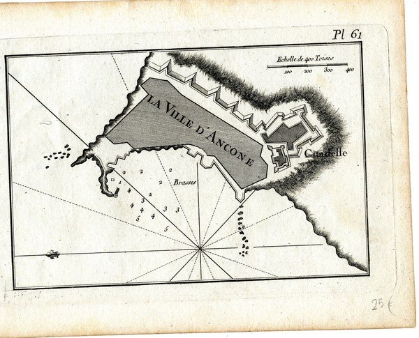 Incisione in rame, presa da "Recueuil des Principaux Plans des Ports et Rades de la Mer Mediterranee". Joseph Roux (1725-1793), celebre cartografo francese., nel 1764 pubblicò un atlante del Mediterraneo in 12 grandi tavole da cui trasse l'atlante dei porti. Buone condizioni. Dimensioni: 25 cm x 18 cm.
