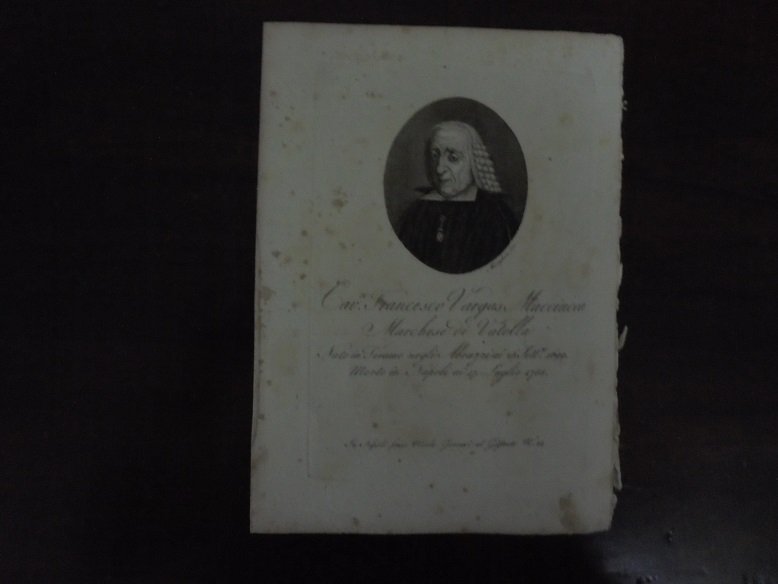 Tratta dalla Biografia degli Uomini Illustri del Regno di Napoli, di Domenico Martuscelli. Stampata a Napoli 1814/1824 da Nicola Gervasi. Ritratto in ovale di mm. 70 x 80 (=lxh) più margini. Firmata in basso a destra: Morghen. Corredata da otto pagine di biografia. Bruniture.