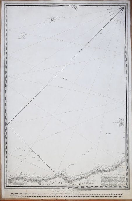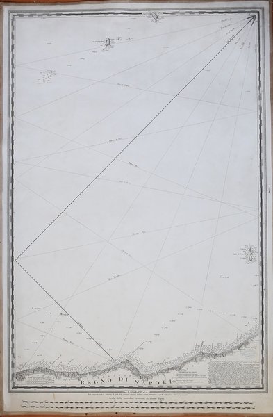 Foglio X della celebre carta Carta di cabotaggio del Mare Adriatico (1822–1824).Raffigura la costa adriatica dell'Abruzzo e del Molile, estesa da nord di Francavilla a sud di Termoli. Sono inoltre rappresentate le isole Tremiti.La Carta di cabotaggio del Mare Adriatico, venne prodotta nell'I.R. Istituto Geografico Militare austriaco, a Milano, in cooperazione con il R. Officio Topografico del Regno di Napoli e con l'Ammiragliato britannico. (Istituto Idrografico della Marina).L'iniziativa fu il frutto di un'attiva collaborazione con l' ammiraglio H. W. Smyth della Marina britannica e con l' Officio Topografico di Napoli, al fine di completare il rilevamento del Mare Adriatico iniziato sotto l'occupazione francese, al quale aveva a suo tempo contribuito anche Charles François Beautemps Beaupré, ingegnere idrografo in capo al Dépôt des cartes dal 1826 al 1839.Ne scaturirono carte costiere a media scala - di cui qualche esemplare è presente presso l' Istituto Idrografico della Marina - e la Carta di cabotaggio del Mare Adriatico disegnata e incisa sotto la direzione dell'I. R. Stato Maggiore generale, 1:750.000, pubblicata a Milano nel 1822-24, in venti fogli oltre il frontespizio e il quadro d'unione, di cui un esemplare è conservato presso l'Ente cartografico italiano.Carta applicata su tela coeva, in pereftto stato di conservazione. Opera molto rara. Plate X of the Carta di cabotaggio del Mare Adriatico (1822–1824).After almost five centuries of development in nautical charts depicting the Adriatic Sea, a systematic, complete hydrographic survey was carried out that resulted in the first modern nautical chart of the area. The survey, a coordinated operation undertaken jointly by Austrian, Neapolitan and British experts in 1818–1819, was the first scientific activity in the Adriatic region to be based on international cooperation. Until then, the gathering, processing and presentation of geographical data on Adriatic nautical charts were neither systematic nor institutionalized activities, so those charts could not serve as reliable, safe sources of different types of information for seafarers and others for whom spatial relations in coastal, island and sea regions were of primary importance. Given the quality and quantity of hydrographical and geographical content presented in the Carta di cabotaggio del Mare Adriatico (Coasting Chart of the Adriatic Sea), it immediately became an essential source of spatial information. Cfr. Josip Fari?i? & Lena Miroševi?, Carta di cabotaggio del Mare Adriatico (1822–1824): A Turning-Point in the Development of Adriatic Maritime Cartography, Imago Mundi Vol. 69 , Iss. 1,2017