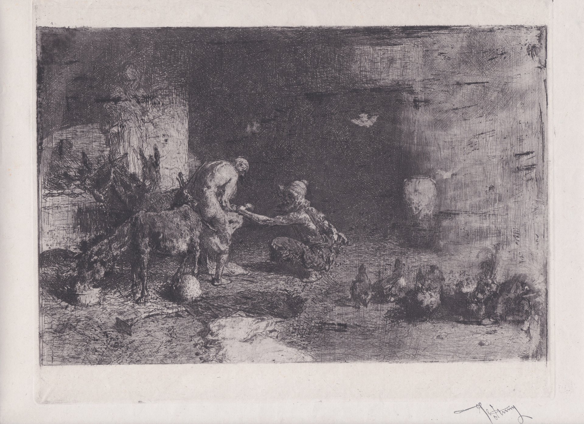In questa stampa, la numero 22 del catalogo, viene rappresentato l'interno di una stalla. Lo sfondo si divide in zone lasciate più chiare e altre scure, su questi giochi chiaroscurali si stagliano le figure di due uomini colti nell'atto di ferrare un asino. In primo piano sulla destra alcune galline e sulla sinistra a terra strumenti di lavoro. Fortuny realizzò anche un olio su tela di ugual soggetto, oggi conservato presso il Museo Nazionale d'Arte della Catalogna. Impressione eccellente molto contrastata su carta leggera tipo China, misure mm 240x325. Prova "avanti lettera" senza titolo e numero, con timbro della firma dell’autore in basso a destra. Secondo Cano Dìaz l'esemplare appartiene alla prima edizione del 1878 eseguita da Goupil a Parigi. La prima edizione prevedeva anche una tiratura su carta vergellata Arches con titoli, numerazione e timbro della firma. Ottimo stato di conservazione. Ampi margini oltre la battuta del rame.