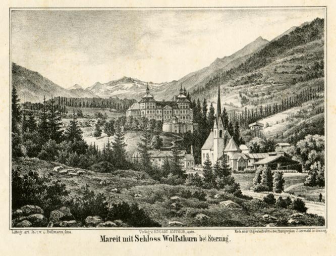 Litografia di dimensioni 11x16 cm. Condizioni : USATO - Stato : Buono, ordinari segni d'uso e del tempo. Altre note : Veduta raffigurante il piccolo centro di Mareta (Mareit) e il castello Wolfsthurn, non lontano da Vipiteno (Sterzing). L'edificio, che fu ricostruito in stile barocco nel diciottesimo secolo, è di proprietà della famiglia Sternbach ed è sede del Museo provinciale della caccia.