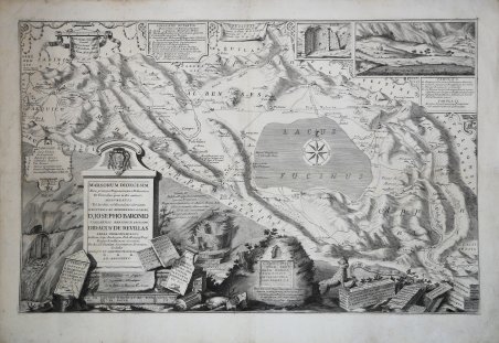 RARISSIMA carta corografica della diocesi marsicana pubblicata nel 1735 da Diego de Revillas ed incisa da Giovanni Battista Sintes. Nel cartiglio a sinistra troviamo il titolo: âMarsorum diocesim nunc primum trigonometrice delineatam et veteribus quae in eâ extant monumentis vel ineditis vel emendatis adornatam illustriss. ac reverendiss. domino D. Josepho Baronio vigilantiss, Marsorum episcopo / didacus de Revillas Abbas Hieronymianus in Rom. Sap. Archigymnasio Publ. Matheseos Prof. regia Londinensis Societatis et Acad. Instituti scientiarum Bononien. Sodalis obsequii et amicitiae tesseram D. D. D. a. d. MDCCXXXV.â Più in basso, âJo. Bapta. Sintes sculpsit Romae sup. pmissoâLa carta costituisce uno dei primi tentativi di applicare le misurazioni trigonometriche per costruire una carta geografica. Descritta da Roberto Almagià âPrimo saggio storico di cartografia abruzzeseâ (pp. 188 â 204) in Rivista abruzzese di scienze, lettere ed arti. Anno XXVII-Fascicolo I (1912):âUna carta assai migliore della diocesi marsicana fu pubblicata a parte, nel 1735, da Diego de Revillas, un dotto abate milanese, probabilmente di origine spagnuola, professore di matematiche nella Sapienza di Roma, e autore di qualche lavoro cartografico, di scritti metereologici ecc. Essa è peraltro rarissima: lâunico esemplare da me visto è in una delle così dette âRaccolte Lafreryâ della Biblioteca Nazionale di Roma. à una incisione in rame che misura cm 67,5 x 43. [â¦] Tutto intorno al quadro, come pure in basso a destra, sono figurate lapidi antiche: in alto vi sono leggende esplicative e due piccole vedute, una delle rovine di un tempio, lâaltra del Fucino e del suo emissario. In alto a sinistra vi è pure la scala, che risulta allâincirca di 1:112 425. Manca qualunque graduazione e indicazione di coordinate ai margini. Nellâinsieme la carta è del tipo di quelle a grandi ornati, assai in uso alla fine del Seicento e nella prima metà del Settecento.I monti in prospettiva, con ombre a destra, sono allacciati in catene, in modo da dare una discreta rappresentazione dellâorografia; si legge: Monti Appenini, e, nella catena marsicana, M. Argatone e M. Marsicano; è indicato anche il Velino. Il disegno dei fiumi è buono come pure la forma del Fucino. Entro il lago è una rosa di otto venti; vi è pure lâemissario Claudio. A SE di Verrecchie è scritto «Salto F, che si ascende sotto terra e rinasce a Tagliacozzo». Sono rappresentati, con piccoli gruppi di case, gli abitati e anche le chiese isolate in campagna e i ruderi; inoltre con due linee parallele, le strade. Noto parecchi nomi interessanti: Campi Palentini, Piano di Marcio (ad est del Fucino), Campo Mizzio, Valle Arciprete, Valle Regia, Valle di Nerva, Valle Roveto, Forca Carosa o Furca Ferrati, e, lì presso, Mons Imeus. Mancano i confini della diocesi.Quale siano stati la portata e il valore delle operazioni di triangolazione che serviron di base a questa carta non è possibile dire; per quella della Diocesi tiburtina, menzionata e lodata dai PP. Boscovich e Maire si sa che lâAutore aveva fatto più di 150 misure angolari; la nostra della diocesi marsicana appare in complesso meno esatta, ma si riattacca indubbiamente allo stesso ordine di lavori. Comunque, è da ricordare che queste operazioni trigonometriche, compiute dal Revillas prima del 1735, sono state le prime di tal genere che si eseguirono in Abruzzo, anzi in tutta lâItalia centrale, e nella nostra regione, restarono, come si vedrà , per lungo tempo le sole.âAcquaforte, impressa su carta vergata coeva, con margini, tracce di colla al verso, in ottimo stato di conservazione.Bibliografia: Roberto Almagià âPrimo saggio storico di cartografia abruzzeseâ (pp. 188 â 204) in Rivista abruzzese di scienze, lettere ed arti. Anno XXVII-Fascicolo I (1912); Ignazio Galli , Diego de Revillas e le prime osservazioni meteorologiche a Roma, in Memorie della Pontificia Acc. Romana dei Nuovi Lincei, vo.