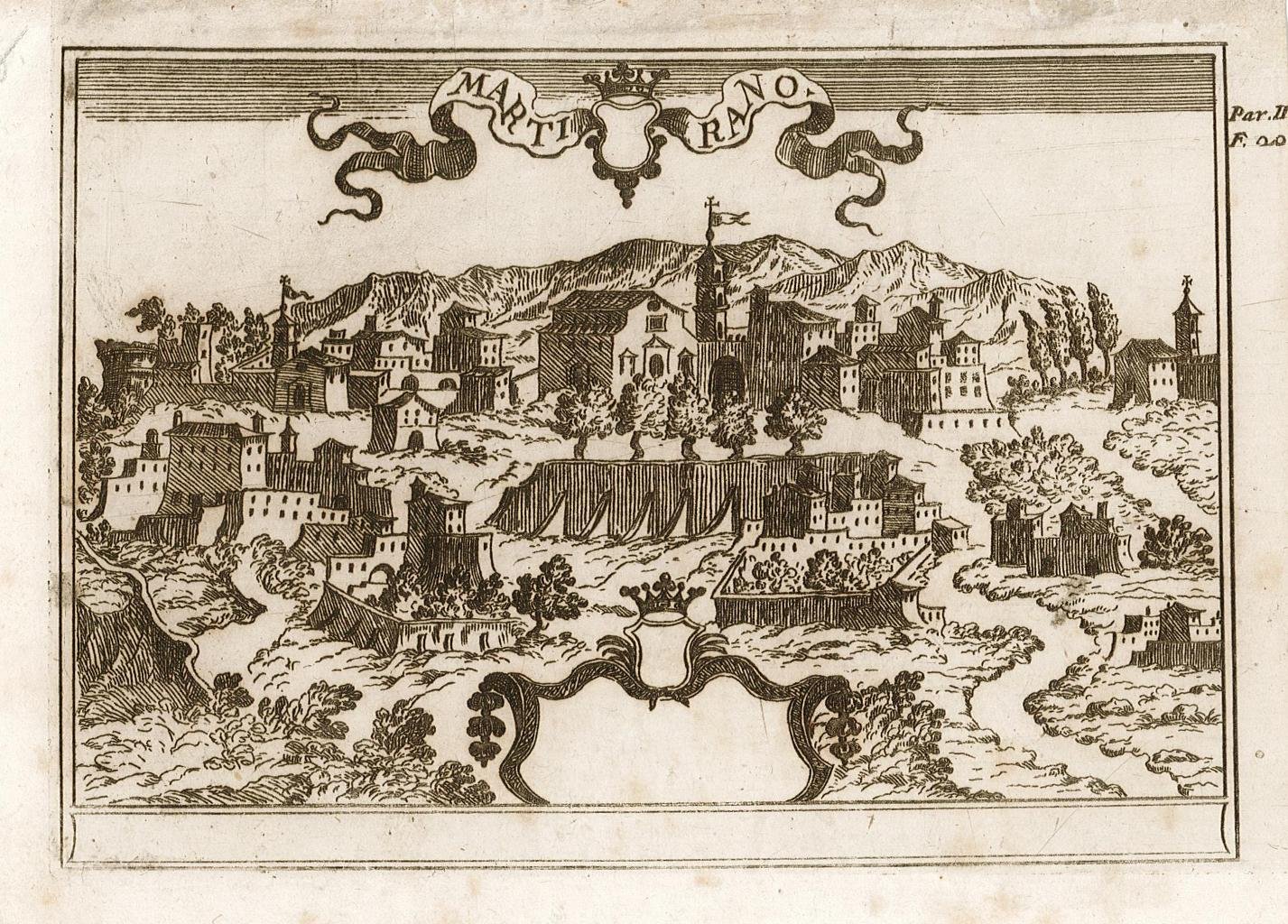 Stampa, antica ed originale, con veduta prospettica della cittadina. Autore: Pacichelli Gio. Battista. Luogo: Martirano - Calabria. Anno: 1703. Tecnica: incisione in rame. Dimensioni: 123x175. Tratta dalla rara opera "Il Regno di Napoli / in prospettiva / diviso in dodeci provincie." pubblicata a Napoli da Michele L. Mutio nel 1703. Incisione stampata con inchiostro bruno