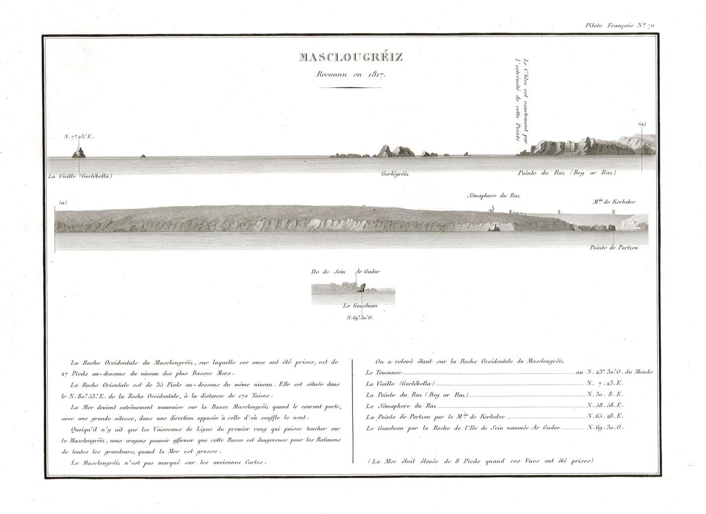 Incisione, antica ed originale, raffigurante le coste del nord-ovest della Francia nel litorale della Bretagna nei pressi di Brest. Inserita nell’opera di Beautemps Beaupré Charles François (considerato il padre della idrografia moderna) “Pilote français, (environs de Brest) / Rédigé / Par M. Beautemps Beaupré Ingénieur Hydrographe en Chef de la Marine, / Membre de l’Académie Royale des Sciences de l’Institut de France… / Publié par ordre du Roi / Sous me Ministère de Son Excellence M.le Marquis de Clermont Tonnerre /.“ Edita a [Parigi]