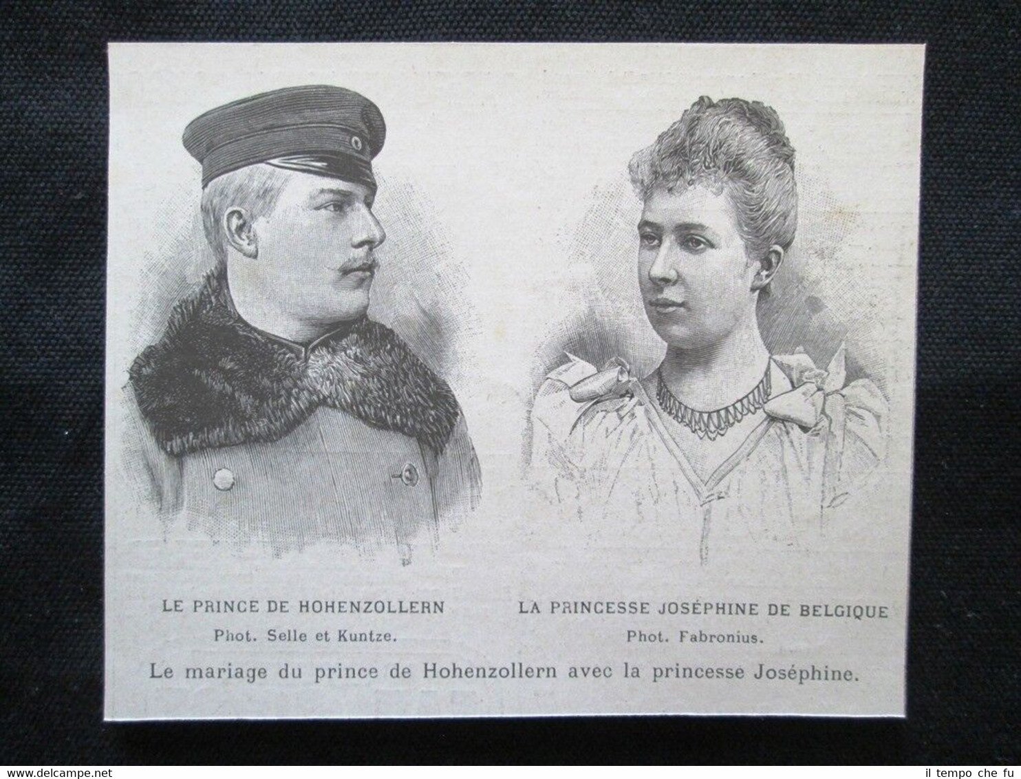 Rara incisione estratta da pubblicazione del 1894 .stampa che ha quindi oltre 124 anni! Il matrimonio del principe di Hohenzollern e della principessa Josephine Il principe Karl Anton di Hohenzollern - La principessa Joséphine del Belgio Dimensioni Cm 11,00 x 10,00 Illustration 1894 - 020 Qualora vogliate delle scansioni migliori contattateci, soddisferemo ogni vostra richiesta. Paypal Carta di credito Bonifico bancario Accuratamente adagiate su un cartoncino e protette da pellicola trasparente rigida, il tutto viene inserito dentro plico di adeguate dimensioni per proteggerne l'integrità.