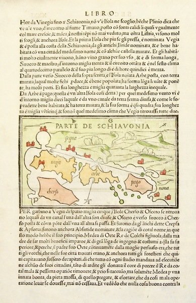 Silografie, mm 83x146 (su foglio 290x200). Coppia di incisioni, tratte da "Isolario nel qual si ragiona di tutte le isole del mondo" pubblicato dal 1528 al 1562. Una delle prime raffigurazioni di Chioggia e di Mazorbo accompagnate al verso da una silografia, mm 80x145, del Quarnaro con Cherso Veglia Pago e Arbe (questa colorata a mano). Ottimo esemplare. <BR><BR><BR>