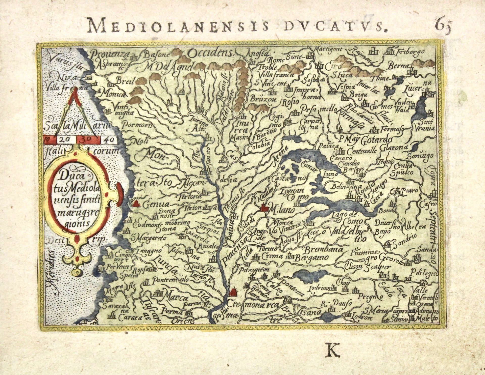 Incisione in rame, fascinosa coloritura posteriore, mm 80x110. Piacevole carta in miniatura tratta da "Epitome du Theatre du monde" una edizione tascabile del "Theatrum Orbis Terrarum" il primo atlante moderno, comprendente carte di tutte le zone del mondo; la geniale intuizione di Ortels, latinizzato successivamente in Ortelius, fu appunto questa: prima d'allora la produzione cartografica era stata irregolare, locale a livello di produzione ed i pochi atlanti, i cosiddetti "Atlanti Lafreriani" erano costituiti su richiesta raccogliendo solo carte di alcune zone. Ortelius riunì in un unico corpus la produzione cartografica eterogenea del periodo, costituendo la base per un'impresa editoriale di enorme successo, pubblicata tra il 1570 e il 1612. Buon esemplare stampato piuttosto decentrato in alto nel foglio, tracce di sporco superficiali.