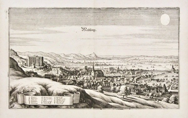 Incisione in rame di mm 195x330. Bella veduta prospettica generale della città di Moedling; in basso una legenda con 15 rimandi. Ottimo esemplare con piccolo strappo restaurato.