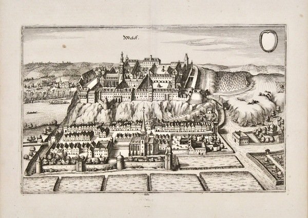 Incisione in rame, 198x313. Bella veduta generale della cittadina con la celebre abbazia. Ottimo esemplare marginoso.