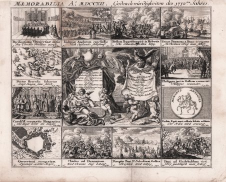 Foglio contenente i più importanti avvenimenti storici dell'anno 1712, tra i quali è raffigurato lo Stato die Presidi e la caduta di Porto Ercole del 22 maro 1712. Tratta dal " Memorabilia Seculi XVIII P. C. N. in Tabulis annalibus aeri incisis. Denckwürdige Begebenheiten des 18ten Jahrhunderts nach Christi Geburt." di Cristhopher Weigel. Incisione in rame, lieve brunitura in alto, per il resto in ottimo stato di conservazione. Rara. Sheet that contains the most important historical events of the year 1712, including the State is represented Deans die and fall of Porto Ercole, 22 maro 1712. Taken from "Memorabilia Secula eighteenth NCPs in Tabulis annalibus incisis planes. Denckwürdige Begebenheiten 18ten Jahrhunderts nach Christi Geburt des ." Cristhopher of Weigel. Copper engraving, slight browning at the top, otherwise in excellent condition. Rara. Cfr.