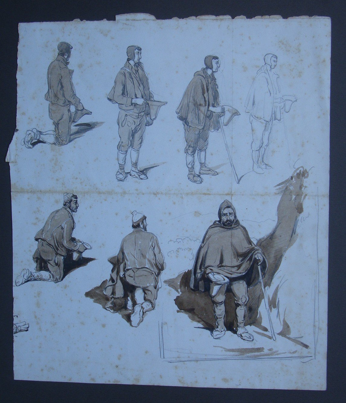 Anonimo. Mendicanti. 1850 ca. Cm.32x38. Prove d’artista su un unico foglio: sette disegni a matita non firmati di cui sei rialzati alla seppia. Verosimile l’attribuzione ad Achille Vianelli.
