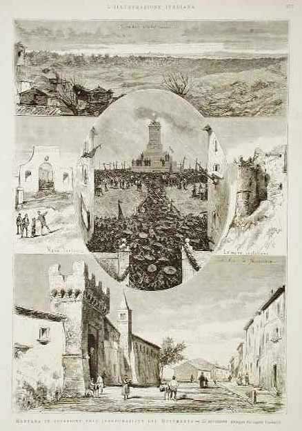 Insieme di piccole vedute di Mentana, in occasione dell'inaugurazione del monumento ai garibaldini. Testo al verso.