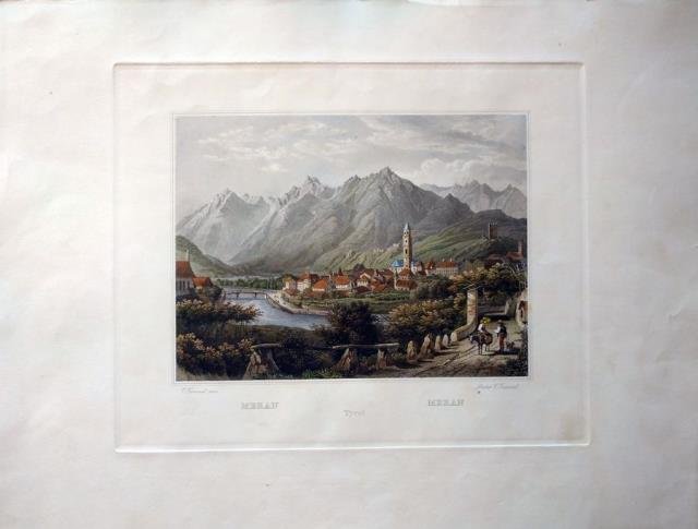 Tiratura del 1880 circa. Incisione su acciaio, recente coloritura, cm 32 x 39 (alla lastra), cm 45 x 60 (il foglio). Carl Ludwig Frommel è stato un pittore e incisore tedesco (Birkenfeld, 1789 – Ispringen, 1863). Situata fra la Val Passiria e la Val D'Adige, l'antica cittadina di Merano con la chiesa gotica di Santo Spirito sulla sinistra del torrente Passirio e l'antica cittadina sull'altra sponda; in lontananza Castel Zeno e Castel Tirolo, le montagne sullo sfondo, e due figure di popolani in primo piano ad animare la scena. Alcune imperfezioni agli ampi margini bianchi ma in piacevole coloritura e in buono stato di conservazione. .