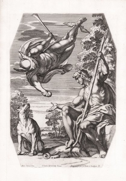 Tavola 3 della serie ' Galeria nel Palazzo Farnese in Roma.del Sereniss. Duca di Parma etc. dipinta da Annibale Carracci intagliata da Carlo Cesio, pubblicata da François Collignon nel 1657, raffigurante gli affreschi realizzati da Annibale Carracci per la Galleria Farnese. L’opera consiste in 44 incisioni all’acquaforte realizzate nella stessa direzione degli affreschi del Carracci. La fama di queste acqueforti, delle quali Cesi realizzò anche una controprova, si deve alla loro fedeltà agli originali. Furono molto apprezzate nonostante la freddezza che spesso questa fedeltà comportava. Dopo la prima stesura, vennero infatti replicate in ben altre cinque edizioni. ' Magnifica prova, impressa su carta vergata, pieni margini, in ottimo stato di conservazione. Esemplare di primo stato con l’indirizzo di Collignon. Carlo Cesio (Antrodoco 1626 - Rieti 1687) è stato un pittore e incisore. Dopo la sua educazione a Rieti, alla fine degli anni ’40 del 1600, si trasferì a Roma dove divenne apprendista di Pietro da Cortona il quale lo presentò a molti mecenati, compresa la Regina Cristina di Svezia e il Cardinal Decio Azzolini. Inoltre, il maestro sostenne la candidatura dell’allievo per l’ammissione alla Accademia di S. Luca nel 1651. La serie di Carlo Cesio (o Cesi) costituisce la prima traduzione grafica italiana di tale ciclo di affreschi. La prima edizione di questa serie venne pubblicata a Roma prima del 1657 e ogni stampa presenta l'indirizzo del Collignon e un numero arabo di serie; la seconda edizione risale sempre al 1657 e si differenza dalla prima solo per l'inserimento di uno scritto intitolato "Argomento della Galeria Farnese dipinta da Annibale Carracci" pubblicato da Vitale Mascardi. Alla morte del Collignon (Roma 1687), le lastre vennero acquistate da Arnold Van Westerhout che ristampò la serie del Cesi con il proprio indirizzo (secondo stato) al posto di quello del Collignon, eliminò il privilegio e i numeri arabi, introducendo una numerazione romana delle tavole. Seguì un'edizione ove il titolo è accompagnato dalla scritta "In Roma nella libraria di Venenzio Monaldini al Corso". Nella quinta edizione l'indirizzo del Monaldini è stato sostituito da quello di Girolamo Mainardi; la sesta ed ultima edizione venne pubblicata a Roma nel 1753 da Venenzio Monaldini con un nuovo titolo: "Aedium farnesiarum tabulae ab Annibale Carraccio .". Bibliografia Bartsch, ' Le peintre-graveur ' (1803-1821) XXI.109.21-64; Bellini P., ' Carlo Cesio ' in “Italian Masters of the Seventeenth Century (The Illustrated Bartsch, vol. 47, 1983)”, pp. 78-99, nn. 021-064; E. Borea, ' Annibale Carracci e i suoi incisori ' (1986). Plate 3 from the series ' Galeria nel Palazzo Farnese in Roma.del Sereniss. Duca di Parma etc. dipinta da Annibale Carracci intagliata da Carlo Cesio ' an album after the fresco ceiling in the Farnese Gallery by Annibale Carracci, published by François Collignon in 1657. The work consists of 44 etchings made in the same direction as Carracci's frescoes. The fame of these etchings, of which Cesi also made a counterproof, is due to their fidelity to the originals. They were much appreciated despite the coldness that this fidelity often entailed. ' ' After the first edition by Collignon, they were in fact replicated in five other editions. ' Etching, printed on contemporary laid paper, with margins, in very good condition. First state with Collignon imprint. Carlo Cesio (Antrodoco 1626 - Rieti 1687) was an Italian painter and engraver. After his education in Rieti, in the late 1640s Cesi went to Rome, where he became a pupil of Pietro da Cortona, who later introduced him to various patrons, including Queen Christina of Sweden and Cardinal Decio Azzolini, and supported his matriculation at the Accademia di S Luca in 1651. The series by Carlo Cesio (or Cesi) constitutes the first Italian graphic translation of this cycle of frescoes. The first edition of this series was published in Rome before 1657 and each print bears Collignon's address and an Arabic series number. The second edition also dates back to 1657 and differs from the first only in the inclusion of an essay entitled 'Argomento della Galeria Farnese dipinta da Annibale Carracci' published by Vitale Mascardi. Upon Collignon's death (Rome 1687), the plates were purchased by Arnold Van Westerhout who reprinted the Cesi series with his own address (second state) instead of Collignon's, eliminated the privilege and the Arabic numerals, and introduced Roman numbering of the plates. This was followed by an edition where the title is accompanied by the inscription 'In Roma nella libraria di Venenzio Monaldini al Corso'. In the fifth edition, Monaldini's address was replaced by that of Girolamo Mainardi; the sixth and final edition was published in Rome in 1753 by Venenzio Monaldini with a new title: 'Aedium farnesiarum tabulae ab Annibale Carraccio .'. Bibliografia Bartsch, ' Le peintre-graveur ' (1803-1821) XXI.109.21-64; Bellini P., ' Carlo Cesio ' in “Italian Masters of the Seventeenth Century (The Illustrated Bartsch, vol. 47, 1983)”, pp. 78-99, nn. 021-064; E. Borea, ' Annibale Carracci e i suoi incisori ' (1986). Cfr.