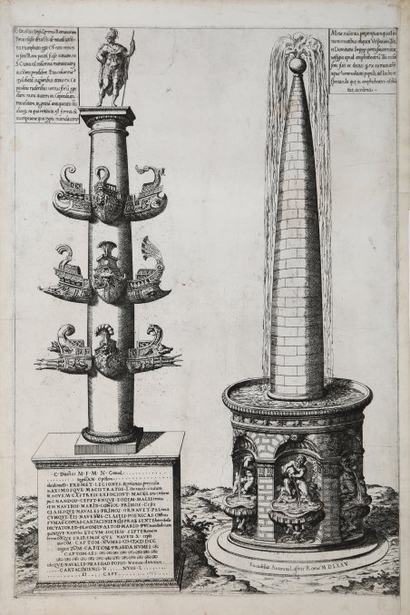 Acquaforte, 1575, datato e firmato in lastra in basso a destra Excudebat Antonius Lafreri Roma[e] MDLXXV. Sebbene non firmata dall’incisore, evidenze stilistiche non lasciano dubbi sull’assegnazione della lastra a Etienne Duperac. Esemplare nel primo stato di quattro, avanti l’indirizzo di Giovanni Orlandi. Magnifica prova, ricca di toni, impressa su carta vergata coeva con filigrana “pellegrino in uno scudo” (Woodward n. 9), con margini su tre lati, margine coevo aggiunto al lato destro, in ottimo stato di conservazione. Iscritto in alto a sinistra: «C[aius] Duilius consul primus Romanorum Poenis claße deuictis de nauali uictoria triumphum egit. Ob eam rem ei in foro Rom[ano] posita[m] fuiße statuam ex S[enatus] C[onsultu] una cu[m] columna rostrata uarij auctores prodidere. Eius columnam stylobata[m] sup[eri]oribus annis ex Capitolinis ruderibus uersus foru[m] egestam, nunc autem in Capitolium translatam, in gratia[m] antiquitatis studiosorum ea qua restituta est forma cu[m] inscriptione ipsa typis mandauimus» [Sconfitti con la flotta i Cartaginesi in vittoria navale, Caio Duilio per primo celebrò il trionfo. Vari autori tramandarono che in onore di lui sarebbe stata innalzata nel foro romano, per decreto del Senato, una statua, insieme con una colonna rostrata. Ora, a beneficio degli studiosi di antichità, noi mandiamo in stampa quella colonna stilobate, nell’aspetto che le ha dato il restauro, insieme con la sua iscrizione, [colonna] che anni addietro dai ruderi del Campidoglio era stata portata nel foro e ora è stata in Campidoglio di nuovo riportata] Iscritto in alto a destra: «Metæ sudantis pr[a]eterquam quod in numismatibus aliquot Vespasiani Titi et Domitiani Imp[eratoribus] percussa [sic per: percussis] cernitur, uestigia apud amphitheatru[m] Titi exsta[n]t. Fons fuit sic dictus q[uod] ex eo manaret aqua[m] commoditati populi, ad ludos et spectacula qu[a]e in amphitheatro edeba[n]tur, accedentis» [Oltre a quello che [di essa] si vede su alcune monete coniate dagli imperatori Vespasiano, Tito e Domiziano, della Meta Sudante sussistono le vestigia presso l’anfiteatro di Tito. Era così chiamata la fontana perché da essa emanava acqua a comodità della gente accorsa all’anfiteatro per i ludi e gli spettacoli]. “La denominazione di meta deriva dalla rassomiglianza della fontana con le mete intorno alle quali nel circo giravano le bighe per le corse che tanto appassionavano i Romani. La costruzione della Meta Sudans, a lato della Via Sacra, risale con molta probabilità all’80 d.C., come documenta una moneta di Tito (79-81) di quell’anno, su cui è raffigurata. Era sormontata da una palla di bronzo con fori da cui scendeva l’acqua lungo i lati del cono. Sotto Costantino (306-337) la fontana fu circondata con una grande vasca. Nel 1936 fu demolita per la sistemazione della Via dell’Impero per fare spazio alle manifestazioni fasciste. La Colonna Rostrata, qui abbinata alla Meta Sudans, fu eretta in onore di Cajo Duilio per celebrare la prima vittoria navale sui Cartaginesi del 260 a.C. Il monumento aveva avuto una prima edizione per Francesco e Michele Tramezzino sotto il Pontificiato di Pio V (1566-1572). Le molte, successive edizioni della stampa per i tipi di Orlandi (1602), Hendrick van Schoel e Domenico de Rubeis sono riprova del successo che il soggetto riscuoteva nel Cinque-Seicento” (cfr. Marigliani, ' Lo splendore di Roma nell’Arte incisoria del Cinquecento). L’opera appartiene allo ' Speculum Romanae Magnificentiae, la prima iconografia della Roma antica. La lastra, essendo successiva alla sua pubblicazione, non figura nell'Indice del Lafreri. ' Lo ' Speculum ' ebbe origine nelle attività editoriali di Antonio Salamanca e Antonio Lafreri (Lafrery). Durante la loro carriera editoriale romana, i due editori - che hanno lavorato insieme tra il 1553 e il 1563 - hanno avviato la produzione di stampe di architettura, statuaria e vedutistica della città legate alla Ro. Etching, 1575, dated and signed in plate lower right Excudebat Antonius Lafreri Roma[e] MDLXXV. Although not signed by the engraver, stylistic evidence leaves no doubt that the plate can be ascribed to Etienne Duperac. Example in the first state of four, before Giovanni Orlandi's address. Magnificent proof, richly toned, printed on contemporary virgin paper with "pilgrim in a shield" watermark (Woodward no. 9), with margins on three sides, coeval margin added to right side, in excellent condition. Inscribed at upper left: "C[aius] Duilius consul primus Romanorum Poenis claße deuictis de nauali uictoria triumphum egit. Ob eam rem ei in foro Rom[ano] posita[m] fuiße statuam ex S[enatus] C[onsultu] una cu[m] columna rostrata uarij auctores prodidere. Eius columnam stylobata[m] sup[eri]oribus annis ex Capitolinis ruderibus uersus foru[m] egestam, nunc autem in Capitolium translatam, in gratia[m] antiquitatis studiosorum ea qua restituta est forma cu[m] inscriptione ipsa typis mandauimus" [Having defeated the Carthaginians with the fleet in naval victory, Caius Duilius first celebrated the triumph. Various authors handed down that in his honor a statue would be erected in the Roman forum, by decree of the Senate, along with a rostral column. Now, for the benefit of scholars of antiquity, we send in print that stylobate column, in the appearance that restoration has given it, together with its inscription, [column] which years ago from the ruins of the Capitol had been brought into the forum and has now been in the Capitol again] Inscribed at upper right: "Metæ sudantis pr[a]eterquam quod in numismatibus aliquot Vespasiani Titi et Domitiani Imp[eratoribus] percussa [sic per: percussis] cernitur, uestigia apud amphitheatru[m] Titi exsta[n]t. Fons fuit sic dictus q[uod] ex eo manaret aqua[m] commoditati populi, ad ludos et spectacula qu[a]e in amphitheatro edeba[n]tur, accedentis" [In addition to what [of it] is seen on some coins minted by the emperors Vespasian, Titus and Dom
