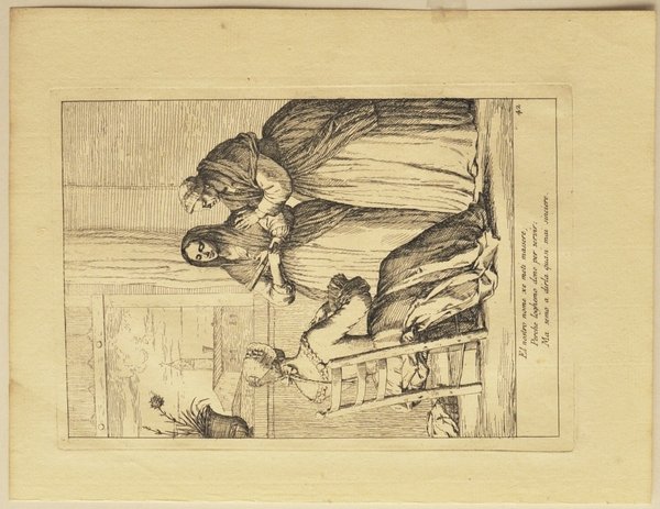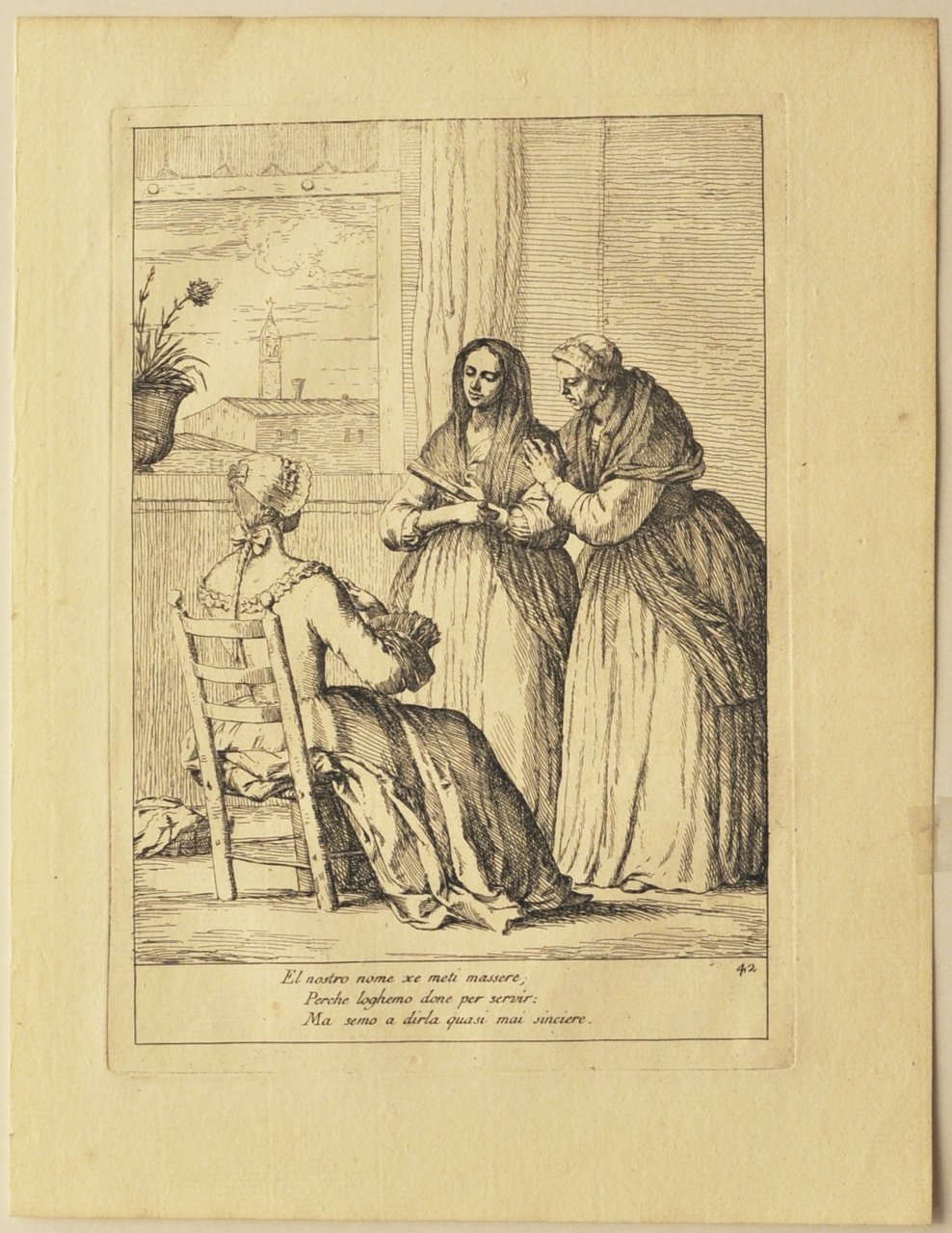Acquaforte e bulino di mm 261 x 182. II/VI. Vergata veneziana tre lune, filigrana tre lune e scritta imperial.Bel foglio a pieni margini. Perfetta condizione."El nostro nome xe meti massere; Perche loghemo done per servir: Ma semo a dirla quasi mai sincere". A destra in basso numero 42. Proveniente da "Le Arti che vanno per via nella Città di Venezia inventate ed incise da Gaetano Zompini. Aggiuntavi una memoria di detto autore" Venezia 1785. Magnifica incisione in acquaforte e bulino della serie delle "Arti che van per via" di Zompini, stampata in una rarissima prima edizione coeva nel 1753, ed in questo secondo stato nel 1785 dal residente britannico John Strange. Venne ripubblicato in Inghilterra altre quattro volte. Da una lettera di John Strange si viene a sapere che la tiratura della presente edizione era di cento o duecento copie. Dario Succi "Da Carlevarijs a Tiepolo, Incisori veneti e friulani del settecento" pag. 454. Dalla "Memoria" di Gianmaria Sasso, premessa a questa edizione: "Gaetano Zompini nacque in Narvesa, nel Territorio Trivigiano, il 29 settembre 1698; ed inclinando da fanciullo alla Pittura, fu mandato a Venezia nella Scuola del Cavalier Bambini in que' tempi riputatissimo. Apprese dal suddetto oltre li principi del buon dissegno, anche in gran parte il suo modo di dipingere, ed uscito poi di detta Scuola si diede anche ad imitare la maniera di Sebastiano Ricci, allora dal medesimo introdotta ed assai stimata.Inventò pure e disegnò per il sig. Zatta, stampatore in Venezia buona parte delle Figure per le Edizioni del Dante e del Petrarca da lui stampata. Questo degno Pittore visse però quasi sempre povero, avendo numerosa Famiglia. Conoscendo per altro il di lui merito il fu Sig. Antonio Maria Zanetti, lo tirò appresso di sé, impiegandolo in vari lavori, ed in particolare in vari disegni, e lavorò in gran parte sopra alcuni rami tratti da' disegni di Gio. Benedetto Castiglione, posseduti dal detto Signore, e che avea già incominciato ad incidere; e per far la raccolta più numerosa, inventò, disegnò, ed incise egli stesso alcuni di detti Rami sul gusto affatto dell'Autore, e toccati con spirito. Non avendo poi esso Sig. Zanetti di che ordinargli di più, s'immaginarono di dare alle stampe una Raccolta delle Arti di Venezia, che vanno per via. Si accinse dunque lo Zompini al lavoro, ed inventò, disegnò, ed incise Rami num.60 rappresentanti l'Arti suddette, e sotto la direzione dello stesso sig. Zanetti, ed a imitazione poi delle Arti di Bologna similmente inventate ed incise dal celebre Annibale Carracci. A quest'opera fatta all'acqua forte, della quale alcune copie furono anche miniate, aggiunse sotto ogni rame alcuni versi il Dottor Questini Prete di Santa Maria Mater Domini, amico tanto dello Zompini, che del Zanetti. Pochi anni dopo mancò di vita il sig. Zanetti, il quale però per ilmerito dello Zompini, gli lasciò una picciola mensuale provigione sua vita durante. Dopo questa disgrazia ne successe allo Zompini un'altra peggiore, incominciandosi ad indebolire la vista; cosicchè alla fine la perdette affatto, e strascinandosi in tal modo fra le miserie e la vecchiaia, mancò di vivere il 20 Maggio 1778 nell'avanzata età di 76 anni.". Dal Succi (Da Carlevarijs ai Tiepolo): ".La prima edizione uscì in due tempi: nel 1753 fu pubblicata una parte comprendente quaranta stampe precedute da un frontespizio calcografico. Nello stesso anno, o più probabilmente, in quello successivo, vennero pubblicate le altre venti tavole.Le due parti vennero in seguito riunite in un unico volume in cui, dopo il frontespizio, compaiono i due indici. A dire del Sasso, alcune copie di questa prima edizione, oggi molto rara, sarebbero state miniate, cioè finemente colorate. Secondo Bozzolato (1978) la tiratura fu di 30-40 esemplari. La seconda edizione fu pubblicata postuma nel 1785 a cura di John Strange, residente britannico a Venezia dal 1773 al 1787, il quale aveva acquistato dagli eredi Zanetti i rami de Le Arti, tramite il proprio incaricato Gianmaria Sasso.I fogli presentano la filigrana delle tre mezze lunecon la scritta SOTO IMPERIAL o le lettere GFA e AV sormontate da una corona, oppure GB sormontate da un fiore. La tiratura di questa edizione fu di cento o di duecento copie. La terza edizione, stampata in Inghilterra dopo il 1787, è facilmente individuabile per la presenza, sotto ogni tavola . Traduzione in lingua inglese dei versetti veneziani di Guestini, oltre che per la presenza della filigrana LEPARD." Seguono una quarta, una quinta edizioni ottocentesche inglesi.