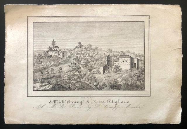 1845 circa. Incisione in rame, b/n, cm 16,5 x 24,5 circa (il foglio). Rocca Pitigliana è un borgo di antiche origini che sorge sulla vetta di una rupe, nella valle del Marano, frazione di Gaggio Montano, attuale provincia di Bologna. Un composto e largo tratteggio rendono il paese e la natura circostante ben visibili. Leggera patina ai margini con impressione un po’ stanca della didascalia, discreto stato. .