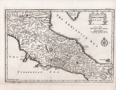 Carta storica dell’Italia centrale, firmata in basso a sinistra J. Davisson Sculpt. Si tratta di una misteriosa variante dell’analoga carta di Emanuel Bowen: “Italia Media o Propria: era verosimilmente così che in epoca la penisola, compresa fra la Gallia e la Magna Grecia. A ricordarcelo è questa piccola carta del Bowen, contenuta con altre, sempre di geografia antica, in una delle edizioni di An Universal History from the Earliest Accounts to the Present Time, opera storica a carattere enciclopedico, alla quale collaborarono molti studiosi. Realizzata in ben 65 volumi tra il 1747 e il 1768 a Londra, costituisce uno dei primi lavori con cui si tenta di unificare la storia dell'Europa occidentale con quella di altre culture del mondo. […] La carta qui riprodotta l'abbiamo trovata del tutto identica nel volume XI della prima edizione del 1747 e nel volume IX di quella successiva del 1779. […] Si noterà che essa non contiene alcuna indicazione viaria e che la terminologia prevalente è in lingua inglese, anche se i toponimi sono per lo più in latino. Un cenno al piccolo tanto da cartiglio sopra le due scale metriche di miglia inglesi e romane, che fa da cornice al titolo: quelle che sembrano essere due agavi fiorite, sorreggono una specie di sipario dove sono infisse due bandiere. Quella di sinistra sembra essere la bandiera inglese, caratterizzata dalla croce di san Giorgio, mentre quella di destra è del tutto indefinibile” (cfr. L’Italia di Mezzo. La cartografia storica del Centro Italia dal XVI al XIX secolo p. 42). Rispetto all’originale è assente la firma di Bowen in basso al centro. L’incisione, sebbene molto simile, è ottenuta tramite l’intaglio di un nuovo rame. Acquaforte, in buono stato di conservazione. ' Bibliografia P. Giorgi, C. Cicioni, L’Italia di Mezzo. La cartografia storica del Centro Italia dal XVI al XIX secolo pp. 42-43, n. 8. Carta storica dell’Italia centrale, firmata in basso a sinistra J. Davisson Sculpt. Si tratta di una misteriosa variante dell’analoga carta di Emanuel Bowen: “Italia Media o Propria: era verosimilmente così che in epoca la penisola, compresa fra la Gallia e la Magna Grecia. A ricordarcelo è questa piccola carta del Bowen, contenuta con altre, sempre di geografia antica, in una delle edizioni di An Universal History from the Earliest Accounts to the Present Time, opera storica a carattere enciclopedico, alla quale collaborarono molti studiosi. Realizzata in ben 65 volumi tra il 1747 e il 1768 a Londra, costituisce uno dei primi lavori con cui si tenta di unificare la storia dell'Europa occidentale con quella di altre culture del mondo. […] La carta qui riprodotta l'abbiamo trovata del tutto identica nel volume XI della prima edizione del 1747 e nel volume IX di quella successiva del 1779. […] Si noterà che essa non contiene alcuna indicazione viaria e che la terminologia prevalente è in lingua inglese, anche se i toponimi sono per lo più in latino. Un cenno al piccolo tanto da cartiglio sopra le due scale metriche di miglia inglesi e romane, che fa da cornice al titolo: quelle che sembrano essere due agavi fiorite, sorreggono una specie di sipario dove sono infisse due bandiere. Quella di sinistra sembra essere la bandiera inglese, caratterizzata dalla croce di san Giorgio, mentre quella di destra è del tutto indefinibile” (cfr. L’Italia di Mezzo. La cartografia storica del Centro Italia dal XVI al XIX secolo p. 42). Rispetto all’originale è assente la firma di Bowen in basso al centro. L’incisione, sebbene molto simile, è ottenuta tramite l’intaglio di un nuovo rame. Acquaforte, in buono stato di conservazione. ' Bibliografia P. Giorgi, C. Cicioni, L’Italia di Mezzo. La cartografia storica del Centro Italia dal XVI al XIX secolo pp. 42-43, n. 8. Cfr.