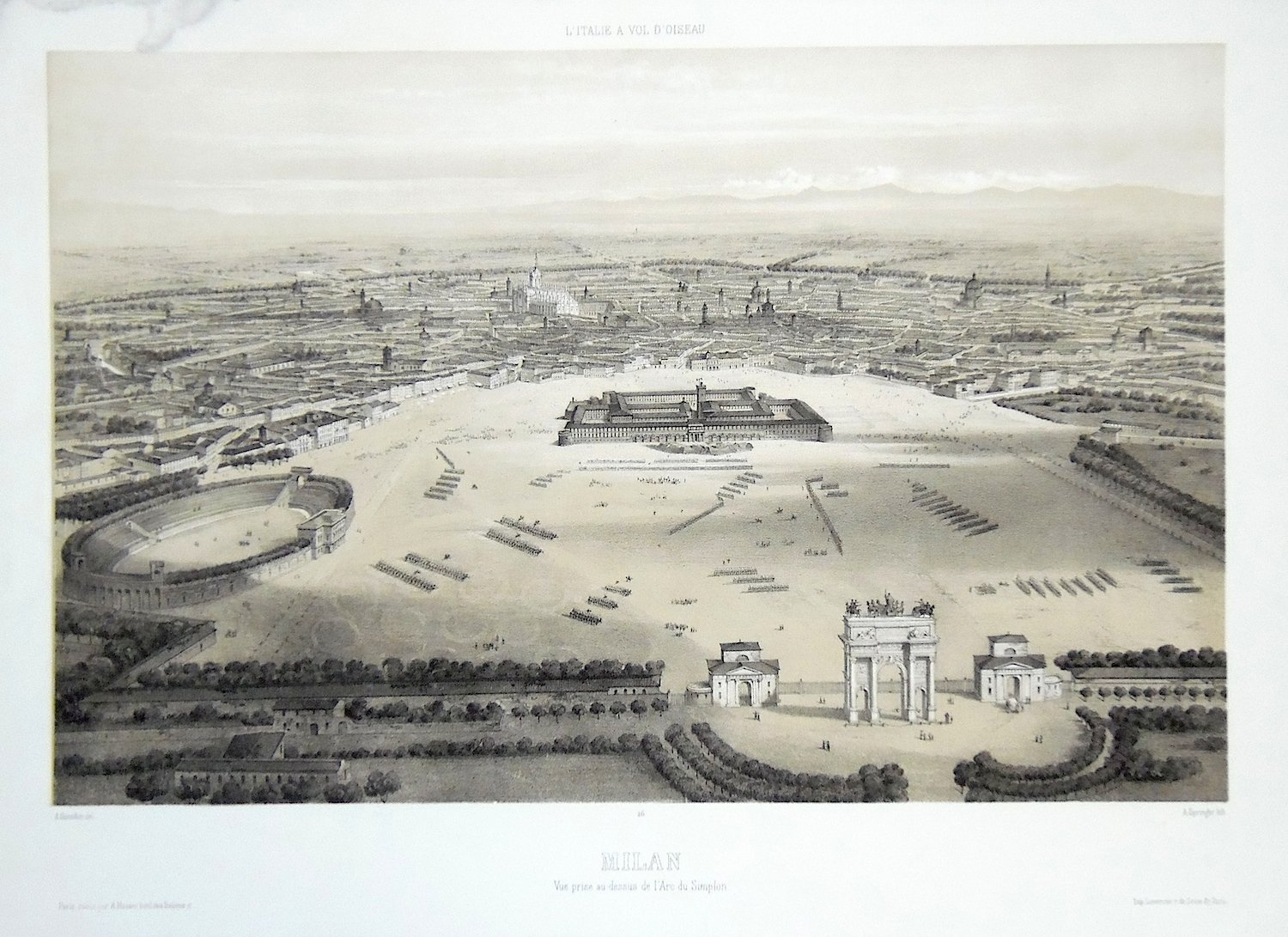Litografia, 280x430. Non comune e fascinosa veduta a volo d'uccello della città lombarda, tratta dal "L'Italie a Vol d'Oiseau", raccolta di vedute delle maggiori città italiane. La particolarità di queste vedute sta nel fatto che i disegni furono effettuati da Alfred Guesdon (1808-1876) a bordo di una mongolfiera. Buon esemplare con ampi margini. Aloni all'angolo sup. sin. che lambisce l'immagine. Esemplare rinfrescato.