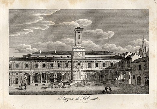 MILANO - "Piazza de Tribunali", animata veduta cittadina con passanti e carrozza.