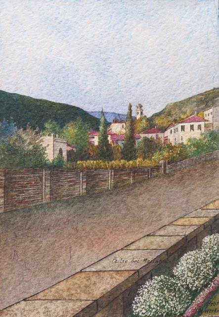 1920 circa. Acquarello, cm 12,8 x 18,2 (il foglio), con titolo e firma in basso a destra. Di gradevole mano, in piacevole coloritura e in ottimo stato di conservazione.