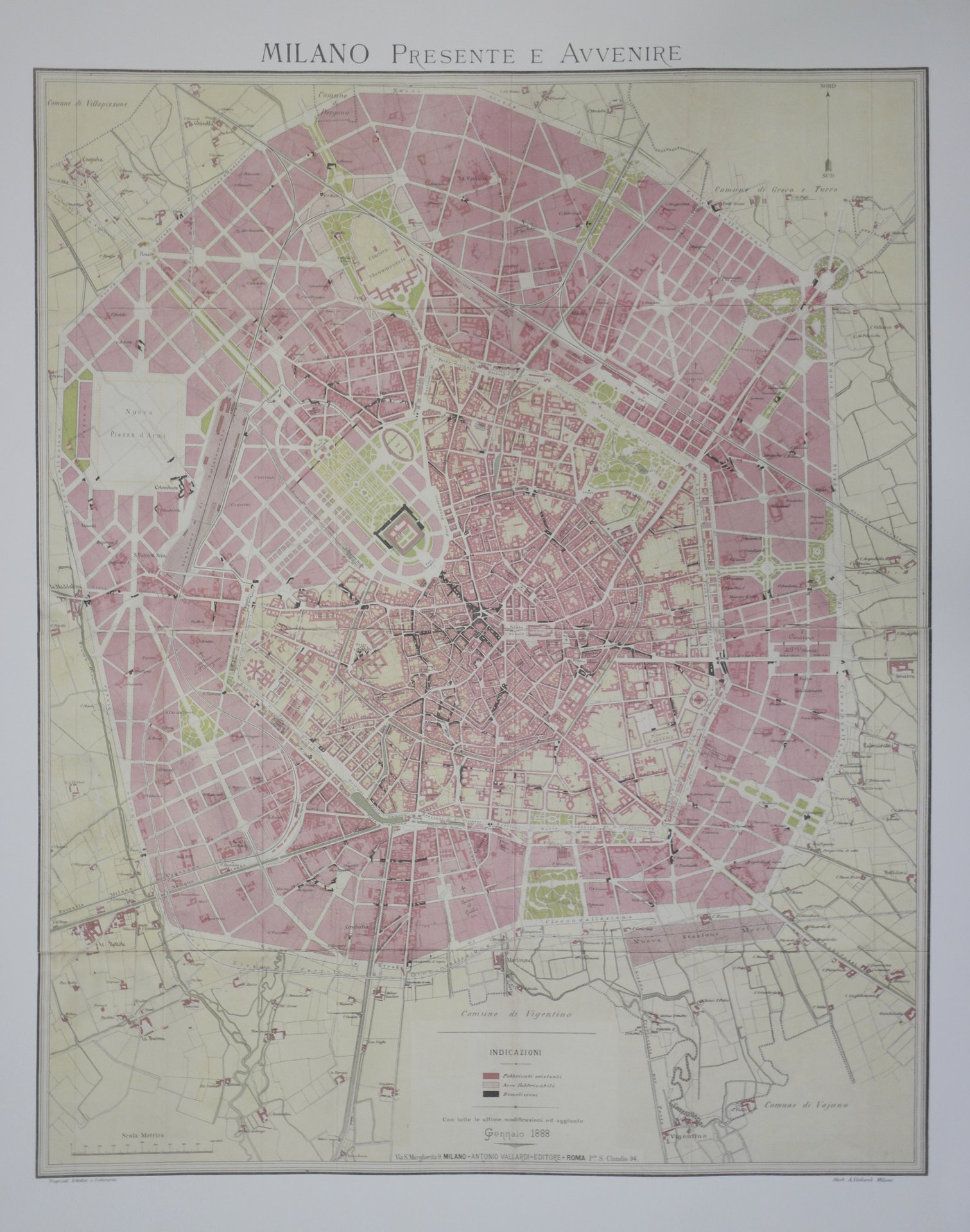 Cm 74x60, riproduzione di una bella carta di Milano, stampata a colori, con l'indicazione delle vie da realizzare secondo il nuovo piano regolatore.In ottimo stato (nice copy).