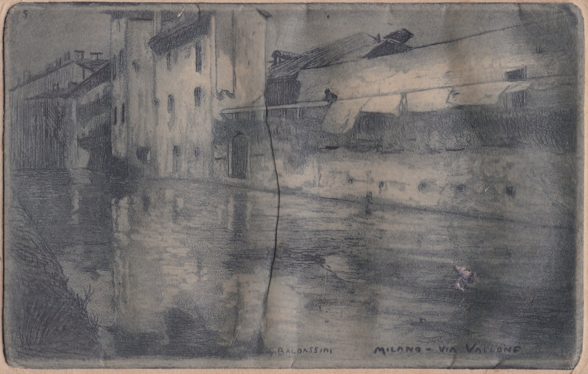 Scorcio del Naviglio Vallone che a partire dal 1929 fu coperto e interrato. Baldassini, appoggiato su una balaustra in pietra, ci mostra i diversi edifici che si rispecchiano sulle acque tra i quali la Torre del sale. Di fronte una figura si appoggia alla balaustra dove sono stesi lenzuoli svolazzanti ad asciugare. Al centro firma incisa: G. Baldassini, più a destra: Milano - via Vallone.