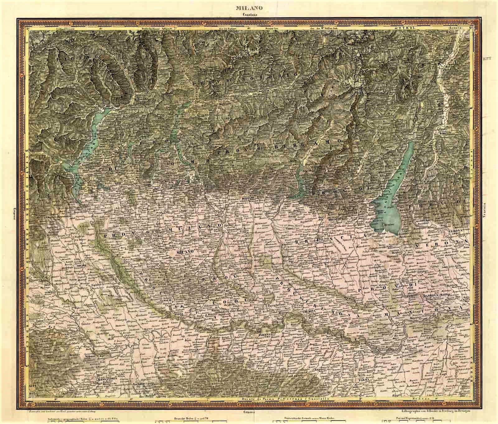 La carta comprende parte delle provincie di Sondrio, Como, Milano e Bergamo, Brescia, Lodi, Pavia, Cremona e Mantova. Secondo Arrigoni-Bertarelli (che riporta la data 1835) fa parte di una raccolta di carte in più fogli della Svizzera. Restauro in basso alla piega.Bibliografia: Arrigoni-Bertarelli, n. 1074
