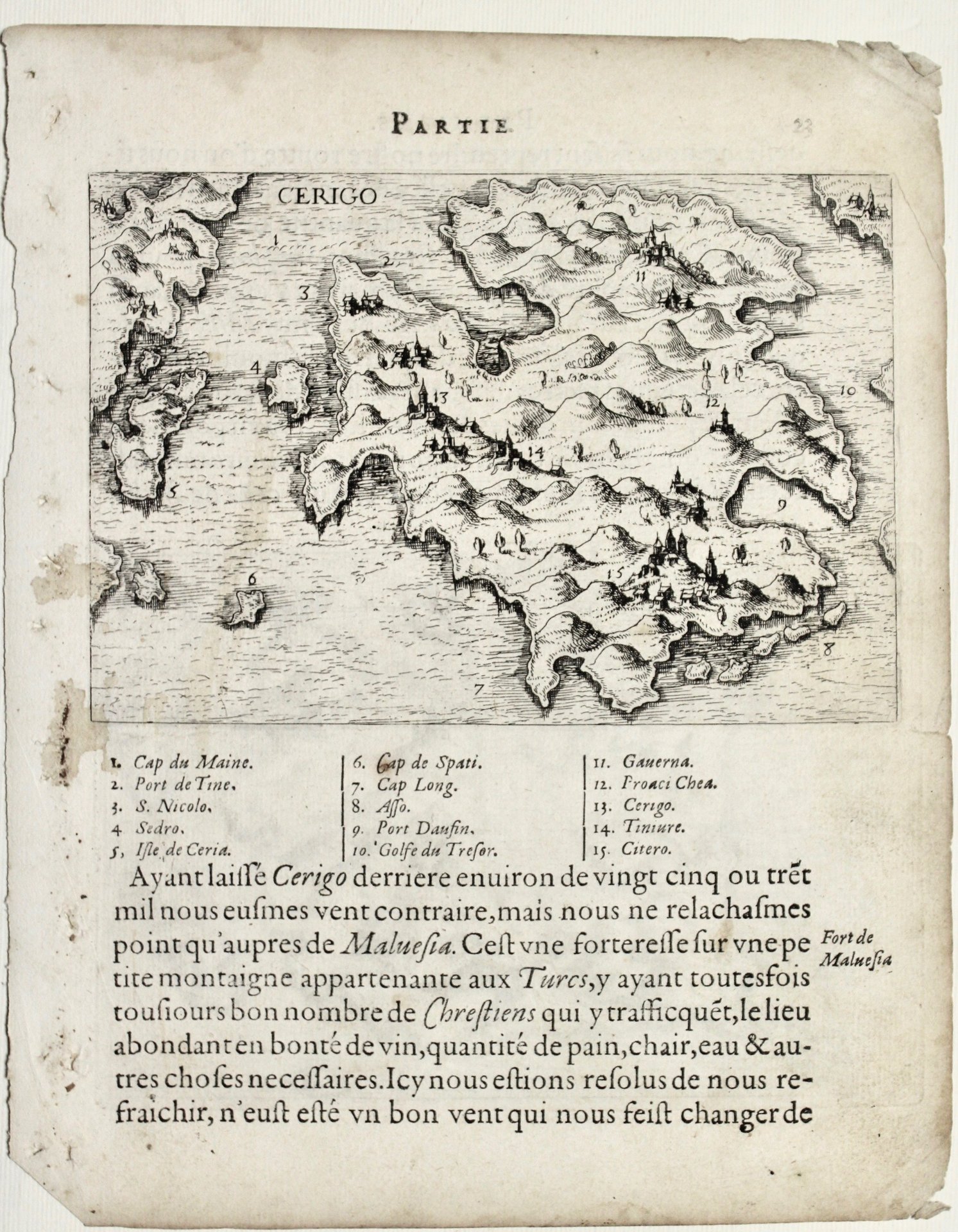 Incisione in rame su foglio mm 230x180, lastra mm 110x155, di Jean Appier Hanzelet tratta da «Relation journaliere du voyage du levant faict & descrit…» L’incisione inserita nel testo francese, riguarda l’isola di Milo ed al verso l’isola di Cerigo. Tratta dall’opera di Beauvau che nel 1605 fece una spedizione attraverso Grecia, Turchia, Cipro, Palestina ed Egitto, uno dei diari di viaggio francesi più ampiamente illustrati della prima metà del XVII secolo relativi al vicino Oriente. Di particolare rilievo è l'uso di Beauvau dell'illustrazione cartografica suggestiva degli isolari italiani del periodo: le 49 mappe e vedute delle isole dell'Egeo, ecc., incise alla maniera di Cantelli e Camocio. Henri de Beauvau, soldato e diplomatico, combatté i turchi in Ungheria prima al servizio dell'imperatore Rodolfo III, e poi sotto l'elettore di Baviera. Intraprese questo viaggio nel 1605, considerandolo un'impresa diplomatica piuttosto che un pellegrinaggio. Discreto esemplare che presenta fori di cucitura originale al margine interno, lievi tracce d’ossido marginali e qualche macchia