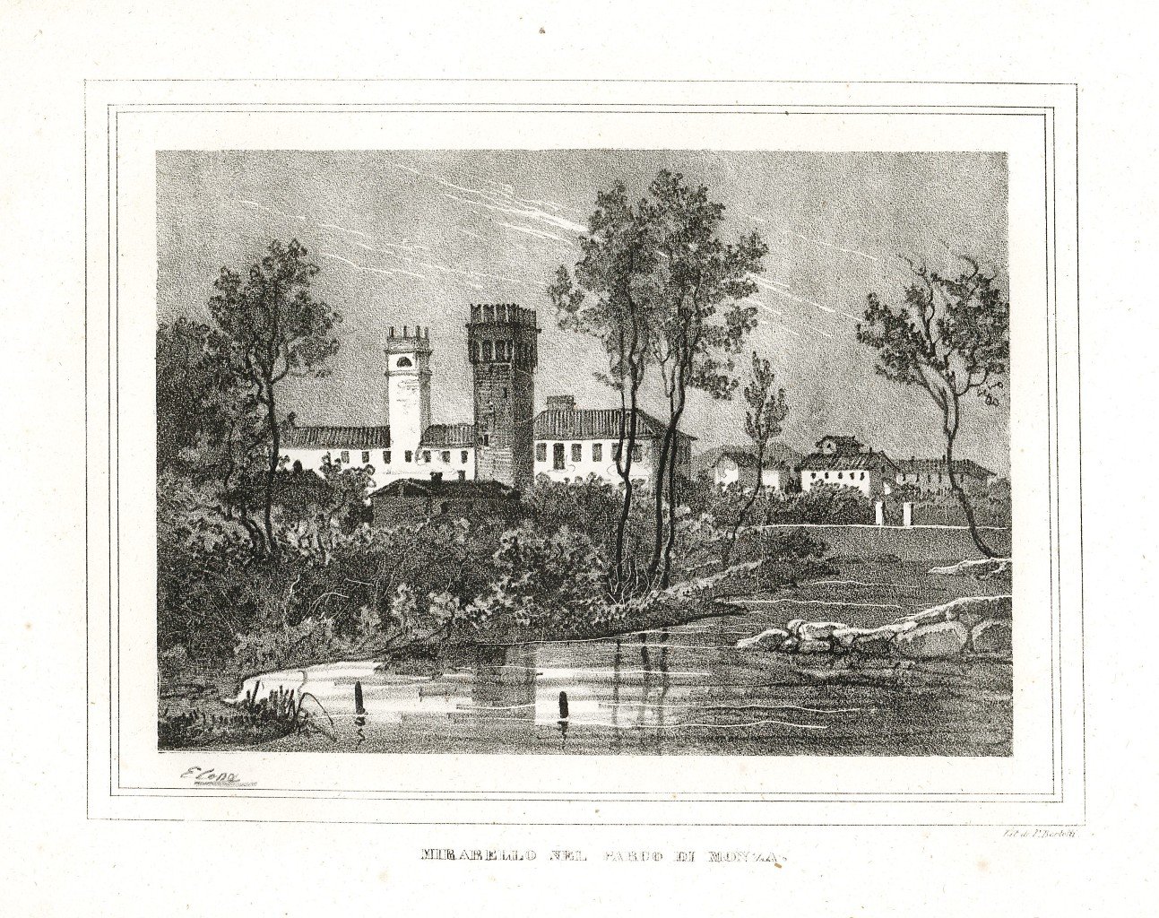 Veduta, antica ed originale, della villa seicentesca nel parco di Monza. Autore: Elena Giuseppe dis. & Bertotti lit. Luogo: Monza. Anno: 1836. Tecnica: litografia. Dimensioni: 170x229 mm