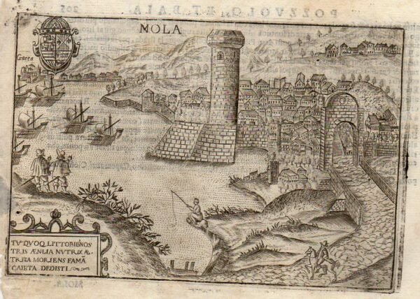 MOLA (Gaeta - Mola) - "Mola - Tu quoq littoribnos tris aenlia nutrix aetrita moriens fama Caieta dedisti" Bella veduta di Mola, fortificata, con Gaeta sullo sfondo.