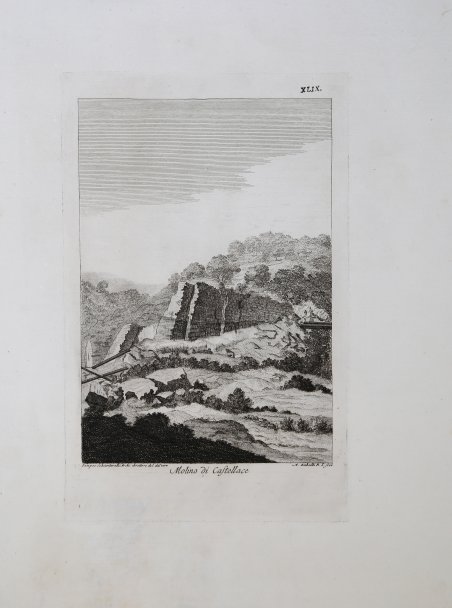 Veduta tratta dal celebre ' Istoria de' fenomeni del tremoto avvenuto nelle Calabrie, e nel Valdemone nell'anno 1783. Posta in luce dalla Reale Accademia delle Scienze, e delle Belle Lettere di Napoli. Napoli, Giuseppe Campo, 1784. Le incisioni dell'Istoria de' fenomeni ' illustrano il rovinoso terremoto calabrese del 1783 e furono commissionate dalla Regia Accademia Napoletana a un gruppo di scienziati, tra cui Michele Sarconi, Angiolo Fasano, Nicolò Pacifico, Padre Eliseo della Concezione e Antonio Minasi, oltre agli architetti e disegnatori Pompeo Schiantarelli, Ignazio Stile e Bernardino Rulli. La spedizione partì da Napoli il 5 aprile 1783 e nel 1784 il resoconto delle sue scoperte fu pubblicato da Campo, rendendola la prima spedizione scientifica sulle conseguenze di un terremoto mai organizzata in Italia. Il terremoto scosse la Calabria e la parte orientale della Sicilia per più di tre anni con diverse scosse, tra cui 5 che registrarono il grado XI della scala Mercalli. Morirono più di 30.000 persone, centinaia di villaggi furono distrutti, le montagne crollarono, i fiumi cambiarono il loro corso creando nuovi laghi e anche le coste furono rimodellate. L'autore dell'Istoria ' è il segretario dell'Accademia, Michele Sarconi. L’Atlante consiste in una raccolta di 68 tavole eseguite dagli architetti Pompeo Schiantarelli ed Ignazio Stile, tutti incisi da Antonio Zaballi, di una grande Carta corografica della Calabria ulteriore, ripiegata più volte, opera di P. Eliseo, e di un disegno raffigurante una «macchina equatoriale». Il progetto di tale opera, unica del suo genere, nasce in seno all’Accademia Napoletana, che istituisce ‘una peregrinazione letteraria nei luoghi della Calabria Ultra e del Valdemone, i quali erano stati i più potentemente della natura ne’ fatal’istanti del suo furore oltraggiati’. La partenza della spedizione degli Accademici Napoletani avviene via mare da Napoli il 5 aprile 1783, un paio di mesi dopo la prima scossa. Il drappello abbastanza nutrito è composto dal segretario dell’Accademia Michele Sarconi, dagli accademici pensionari Angiolo Fasano, Nicolò Pacifico, P. Eliseo della Concezione Teresiano e P. Antonio Minasi Domenicano, dai soci D. Giulio Candida, D. Giuseppe Stefanelli, D. Luigi Sebastiani, dagli architetti addetti ai disegni, Pompeo Schiantarelli con l’incarico di direttore, D. Ignazio Stile e D. Bernardino Rulli. Nella suddivisione dei compiti, il segretario Sarconi prende con sé il disegnatore D. Pompeo Schiantarelli, mentre Pacifico, Fasano e Sebastiani si fanno seguire da D. Ignazio Stile. D. Bernardino Rulli viene aggregato a P. Eliseo e a P. Minasi. Incisione in rame, stampata su carta vergata coeva, minimi aloni di umidità e ossidazioni, per il resto in ' ottimo stato di conservazione. View taken from the ' ' Istoria de' fenomeni del tremoto avvenuto nelle Calabrie, e nel Valdemone nell'anno 1783. Posta in luce dalla Reale Accademia delle Scienze, e delle Belle Lettere di Napoli. Naples: Giuseppe Campo, 1784. The engravings of the ' Istoria de' fenomeni ' illustrate the ruinous Calabrian earthquake of 1783 and were commissioned by the Neapolitan Royal Acadamy to a group of scientists, including Sarconi himself, Angiolo Fasano, Nicolò Pacifico, Padre Eliseo della Concezione and Antonio Minasi, as well as the architects and draughtsmen Pompeo Schiantarelli, Ignazio Stile and Bernardino Rulli. The expedition left Naples on 5th April 1783, and in 1784 the account of their findings was published by Campo, making it the first scientific expedition on the consequences of an earthquake ever to be organised in Italy. The earthquake shook Calabria and the eastern part of Sicily for more than three years with several tremors, including 5 which registered grade XI on Mercalli's scale. More than 30,000 people died, hundreds of villages were destroyed, mountains collapsed, rivers changed their course creating new lakes, and even the coastline was reshaped. Copperplate, printed o contemporary laid paper, ' minimal humidity and oxidation marks, otherwise in excellent condition. Cfr.