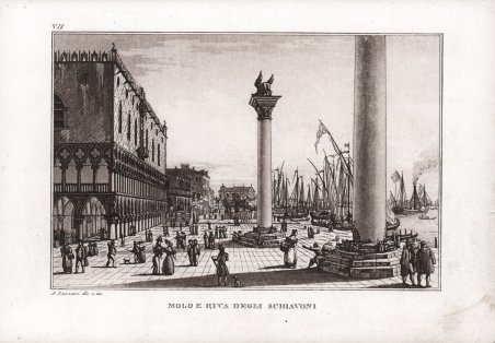 Acquatinta, firmata in basso a sinistra, sotto l'immagine "A. Lazzari dis. e inc.". Esemplare in ottimo stato di conservazione, tratto dall'opera "Itinerario interno e delle isole e della città di Venezia inciso e descritto in quattro parti" nell'edizione della tipografia veneziana Antonelli del 1832. Antonio Lazzari (1798-1834), ' disegnatore e incisore, fu allievo del Cipriani. Formatosi all’Accademia delle Belle Arti di Venezia, Lazzari eccelse nella tecnica dell’acquatinta, alla quale dedicò gran parte della sua produzione artistica. Aquatint, signed at lower left, below image "A. Lazzari dis. and inc." Exemplar in very good condition, taken from the work "Itinerario interno e delle isole e della città di Venezia inciso e descritto in quattro parti" in the 1832 edition of the Venetian printer Antonelli. Antonio Lazzari (1798-1834), draughtsman and engraver, was a pupil of Cipriani. Trained at the Accademia delle Belle Arti in Venice, Lazzari excelled in the technique of aquatint, to which he devoted much of his artistic production. Cfr.