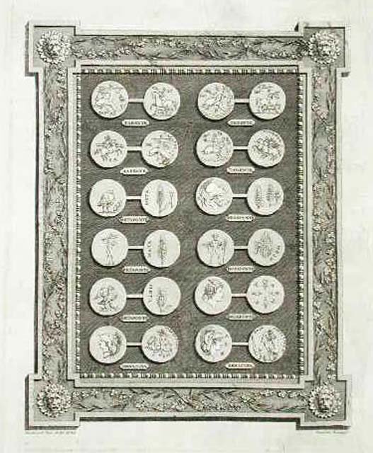 Raffigurazioni di 12 monete entro ricco cartiglio di.: Tarente, Metaponte, Heraclea. Testo al verso