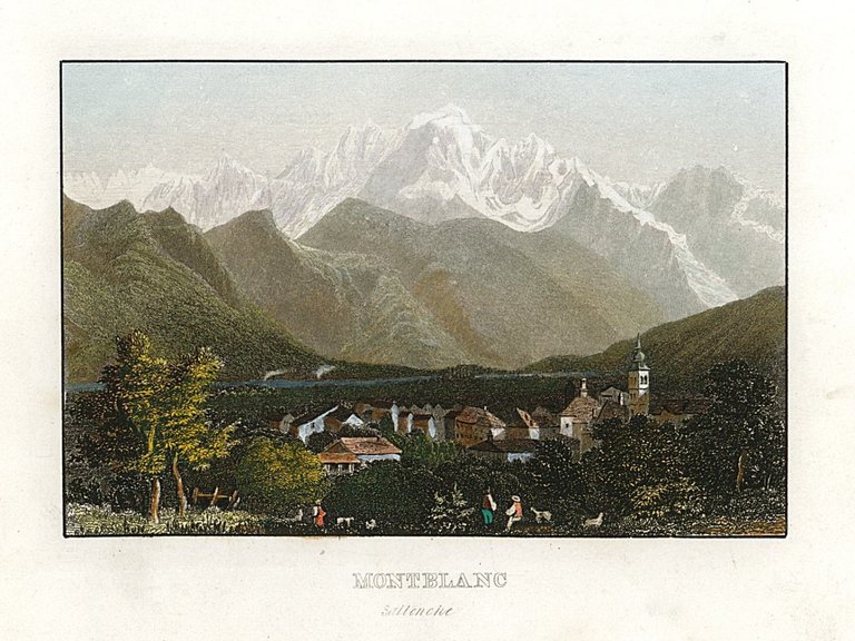 Veduta della vetta del Monte Bianco visto dal paese di Sallanche. Autore: anonimo. Luogo: Monte Bianco. Anno: 1840 ca. Tecnica: incisione in acciaio. Dimensioni: 69x105 mm