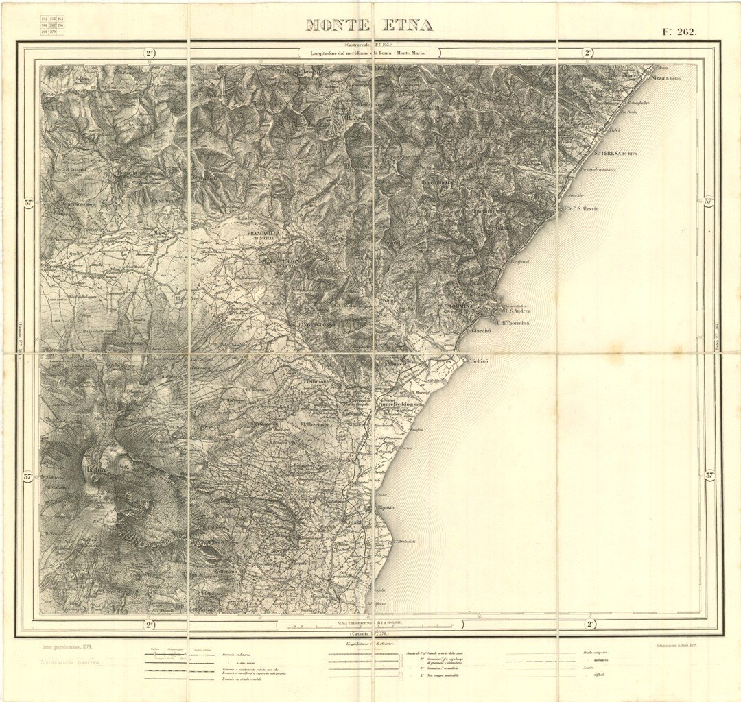 Carta geografica di una porzione del territorio siciliano Foglio nr 262 della Grande Carta Topografica del Regno d'Italia alla scala 1:100.000 progettata in 277 fogli di cui 28 della Sicilia. La mappa molto dettagliata evidenzia, città, paesi, frazioni, cascine, strade, ferrovie, fiumi e torrenti, è telata editorialmente in 8 stacchi e rappresenta il territorio di: costa di mare da Nizza di Sicilia ME a Praiola CT, Roccella Valdemone, Roccalumera, Francavilla, Castiglione Linguaglossa, Taormina, Giardini, Piedimonte Etneo, Fiumefreddo, Giarre,Monte Etna e Zafferana