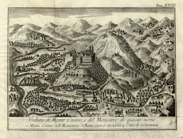 MONTECASSINO. - "Veduta di Monte Casino, e del Monistero di questo nome." Bella Veduta del monte, con il Monastero e la zona circostante.